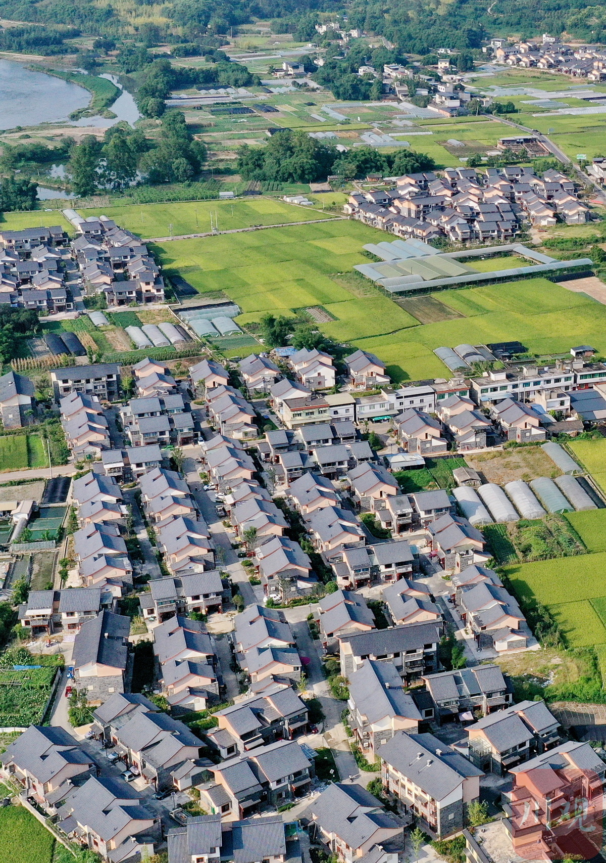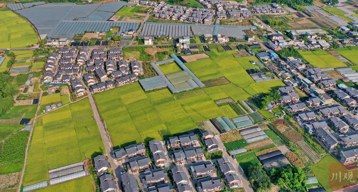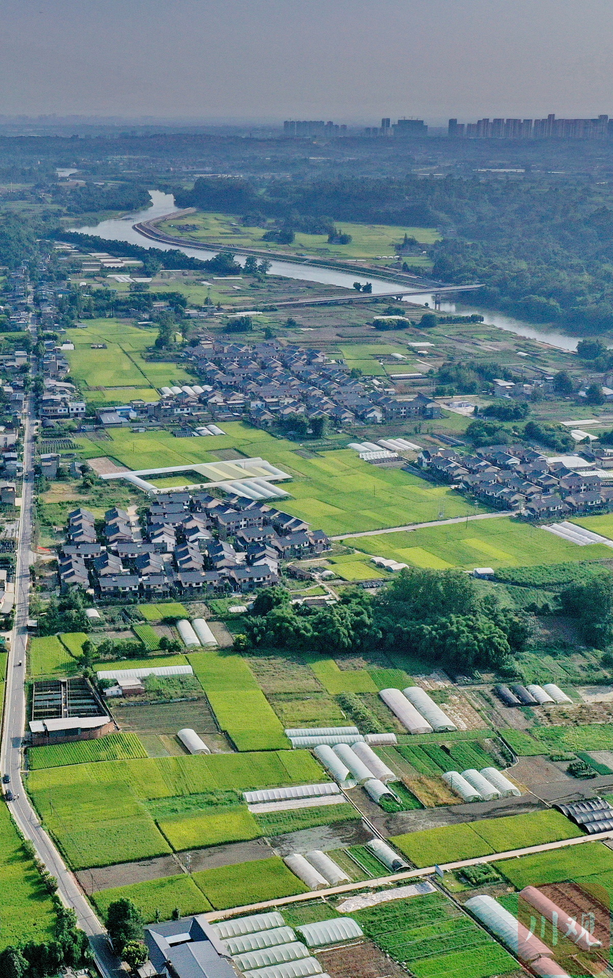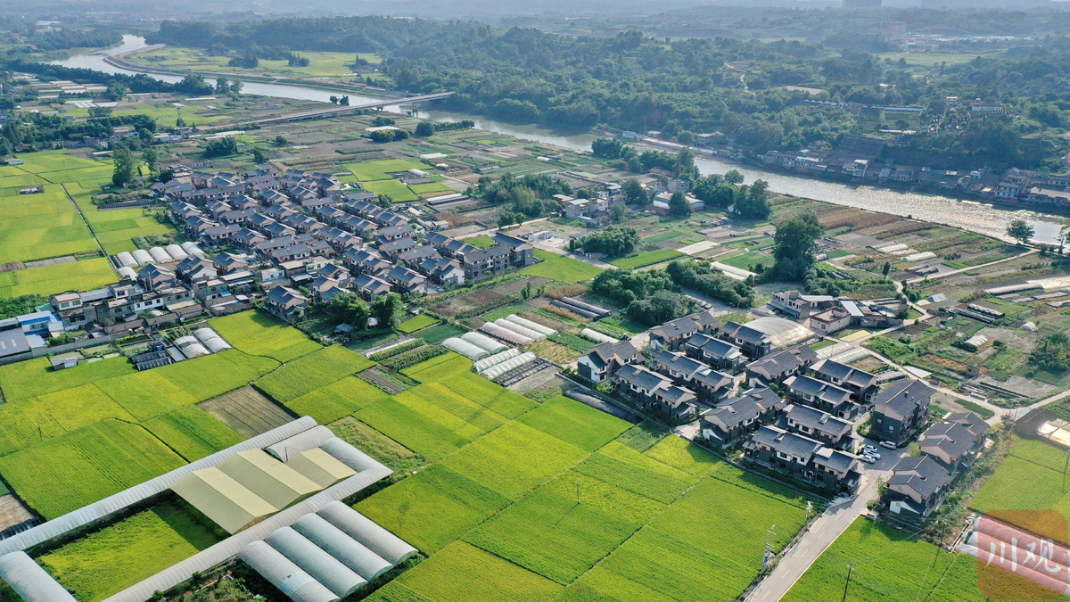 8月14日,在成都市双流区永安镇双坝村俯瞰,只见青山绿水中,一幢幢青瓦白墙的川式新居错落有致,房前屋后被一块块绿油油农田和产业包围着,一片片统一风格的新居成为一道道靓丽的风景线。
