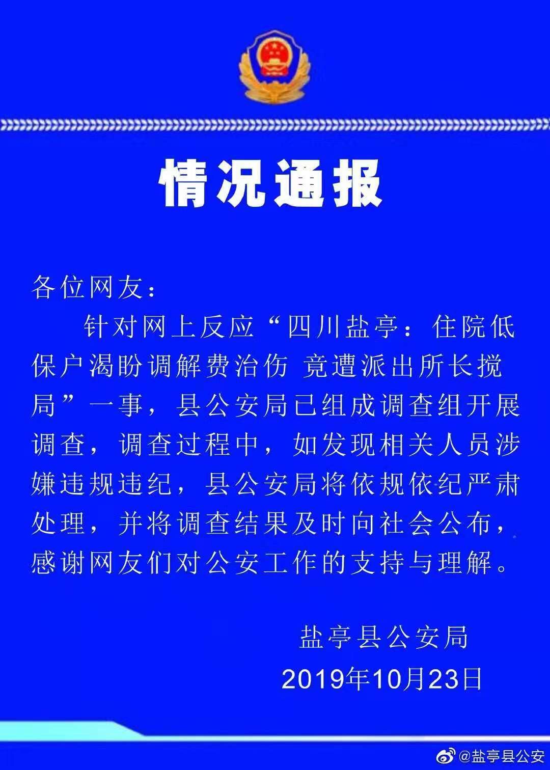 10月23日下午盐亭县公安局通报称,针对网上反映的盐亭住院低保户渴盼调解费治伤、竟遭派出所长搅局一事,县公安局已开展调查。