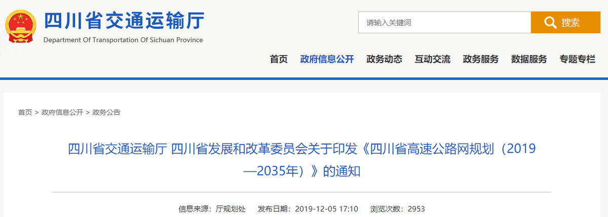《四川省高速公路网规划(2019-2035 年)》公开文件相关通知截图