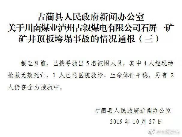 据古蔺县委外宣办官方微博消息,截至目前,古蔺矿井顶板垮塌事故已搜寻救出5名被困人员,其中4人经现场抢救无效死亡,1人已送医院救治、生命体征平稳,另有2人仍在全力搜救中。