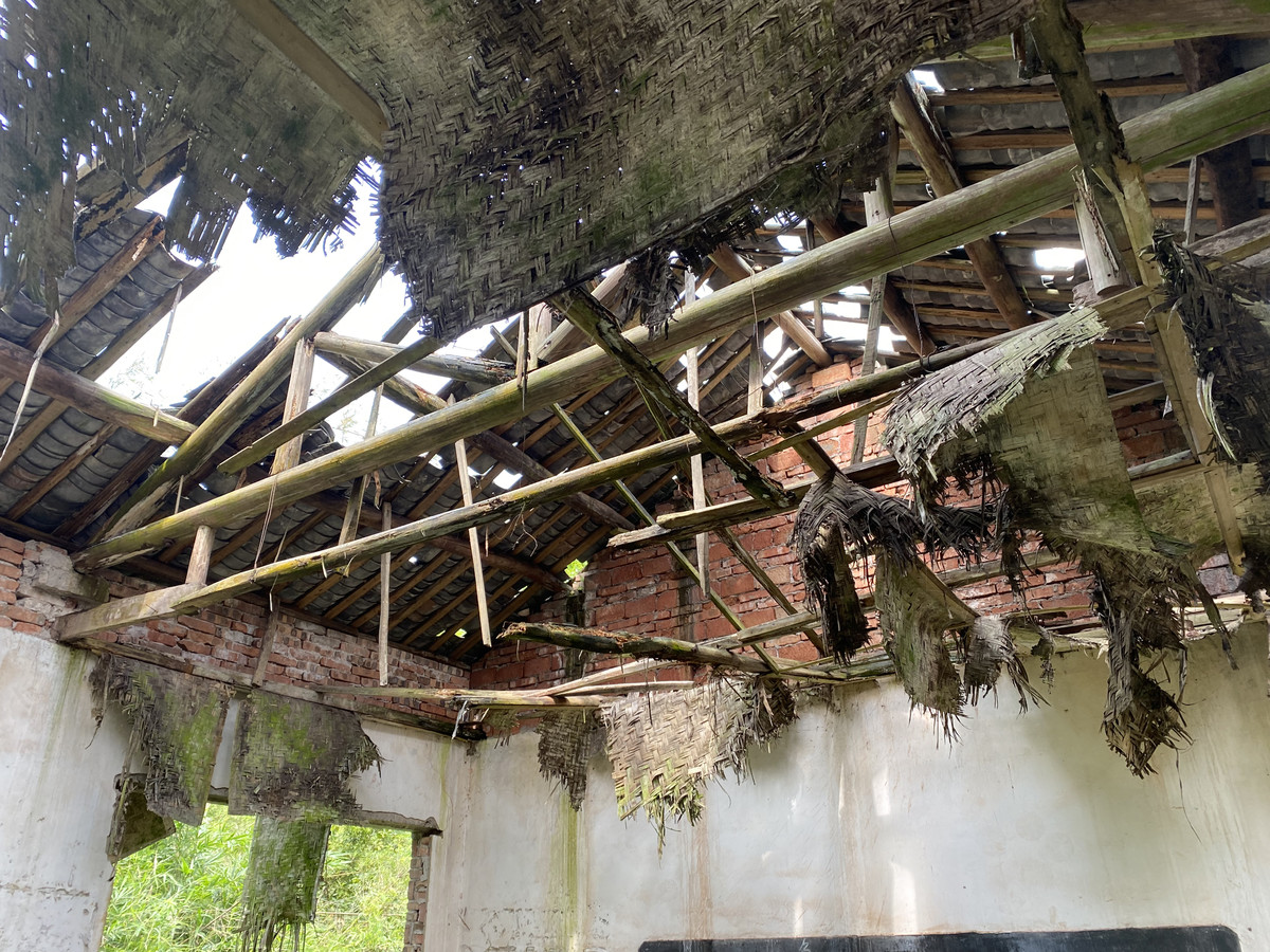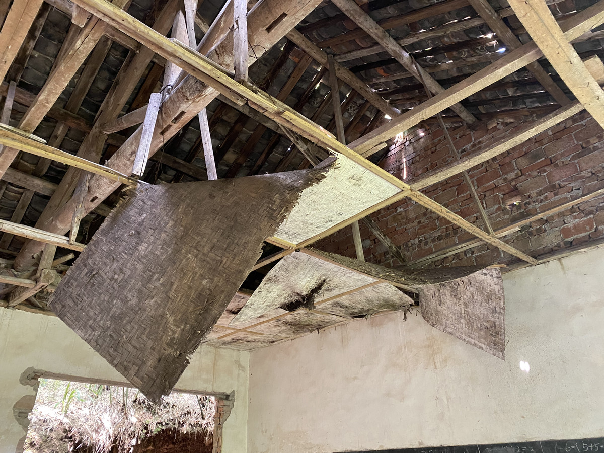 暗访组走进这座小学,发现整个房屋已经破败,四周长满了杂草,屋顶上多处瓦片脱落,老砖墙面裂缝明显,顶部的椽子檩条裸露腐朽。