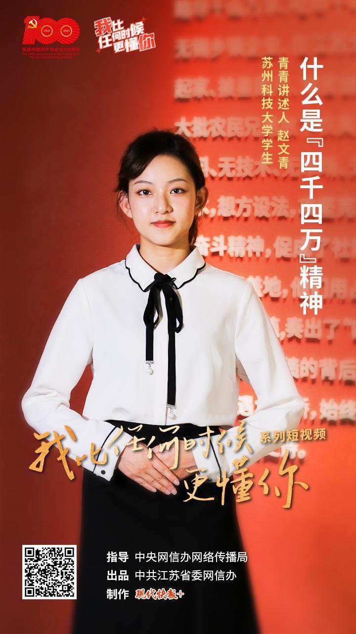 8 月 20 日," 我比任何时候更懂你 " 系列短视频第 27 集《什么是 " 四千四万 " 精神?》上线,本集青青讲述人是苏州科技大学学生赵文青。