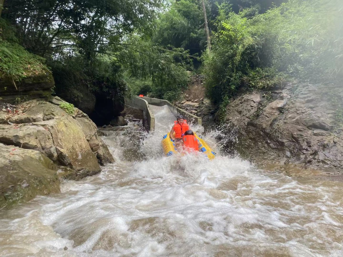 “非常刺激!沿途的自然风光很美。”27岁的贺丽永住在华蓥城区,几乎体验过广安及周边地区的所有漂流。当天的漂流,尤其是尾段的玻璃滑道让她很享受。“但有的河段水量不够,且石块较多,导致橡皮艇容易陷在石间,得下来推。”