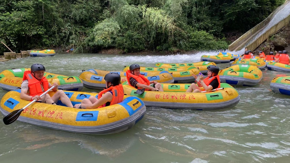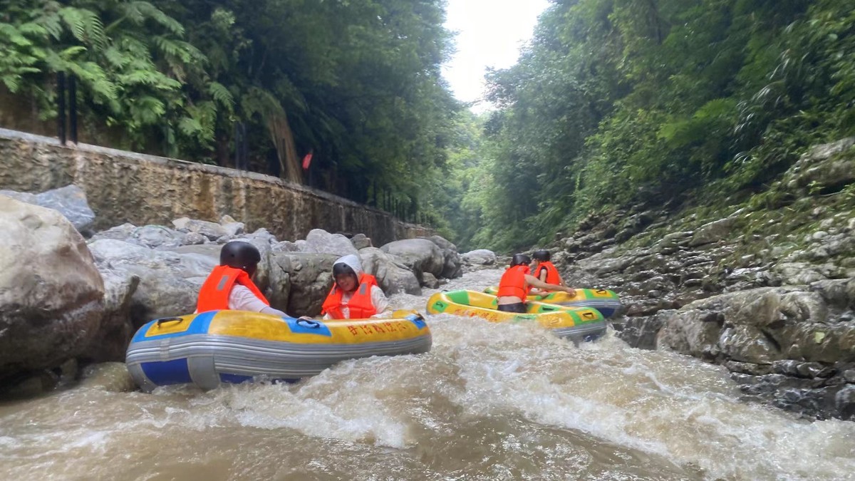 “啊啊啊……”郁郁葱葱的山林中,伴随着游客尖叫声,一艘艘橘色橡皮艇随着激流,从峭壁飞流而下,溅起大片水花。