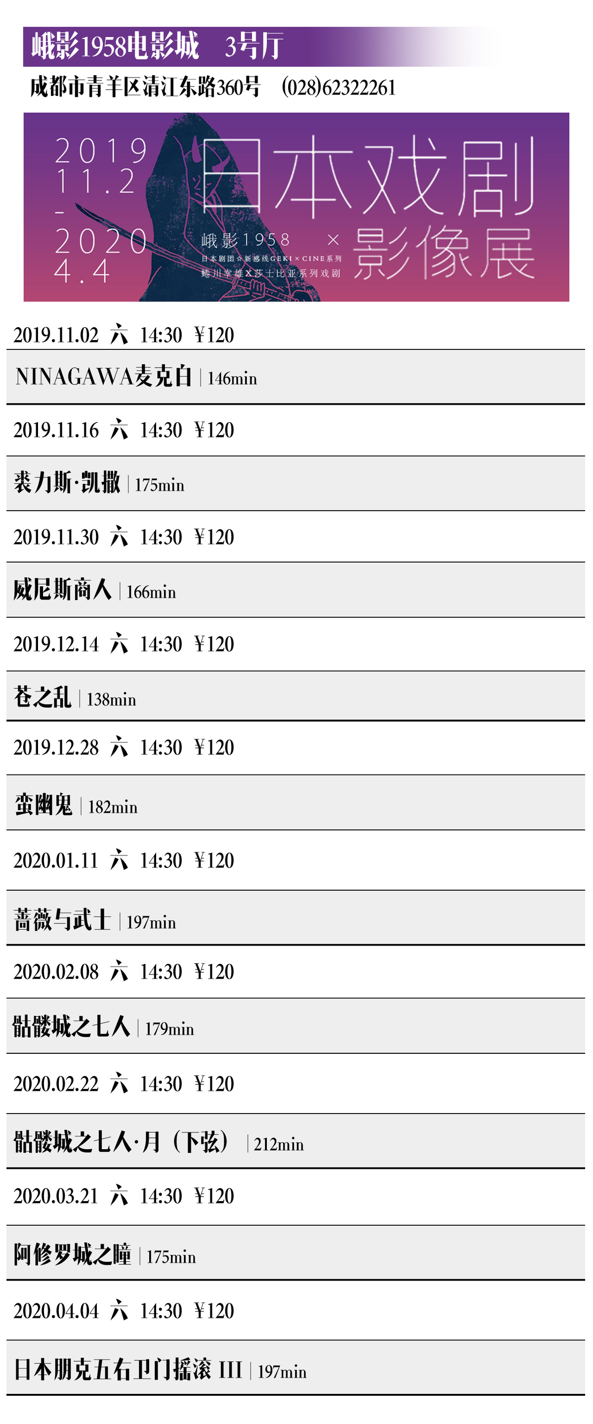 2019年11月2日起至2020年4月4日,每隔两周的周六都将在峨影1958电影城播放由X-LIVE独家授权的戏剧影像系列,为成都观众全力呈现日本剧团☆新感线GEKI×CINE系列戏剧影像以及国宝级导演蜷川幸雄X莎士比亚系列戏剧影像。