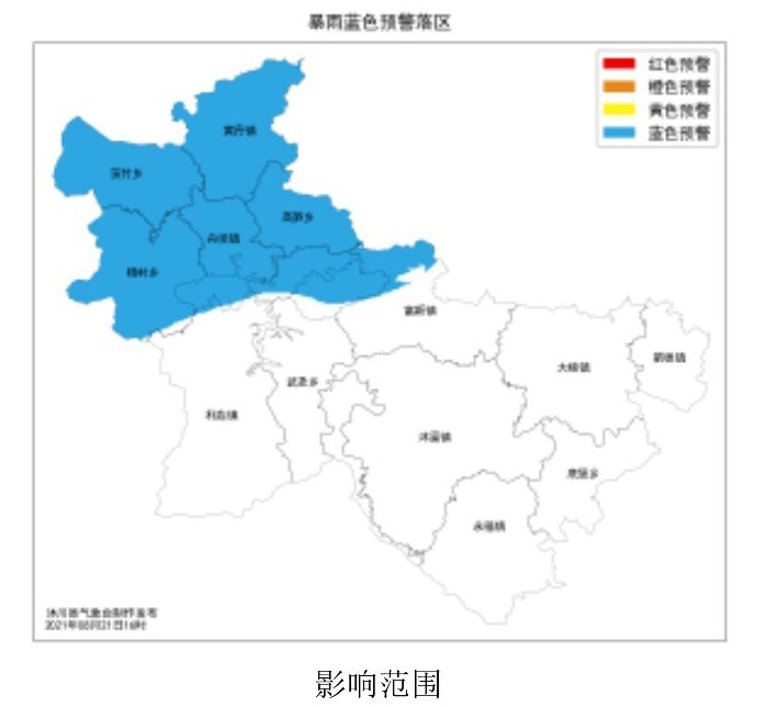 乐山市气象台发布暴雨蓝色预警:预计,今天(8月21日)晚上到明天白天,全市大部地方有中到大雨(20-40mm),其中市中区、五通桥区、沙湾区、夹江、峨眉、犍为、井研的部分地方和峨边、马边、沐川的北部将有暴雨(50-80mm),个别乡镇可达100mm以上,雷雨时伴有阵性大风和短时强降雨等强对流天气,请注意防范。