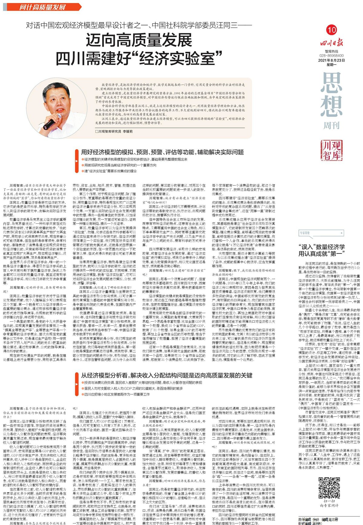 川观智库对话中国宏观经济模型最早设计者之一、中国社科院学部委员汪同三:迈向高质量发展 四川需建好“经济实验室”