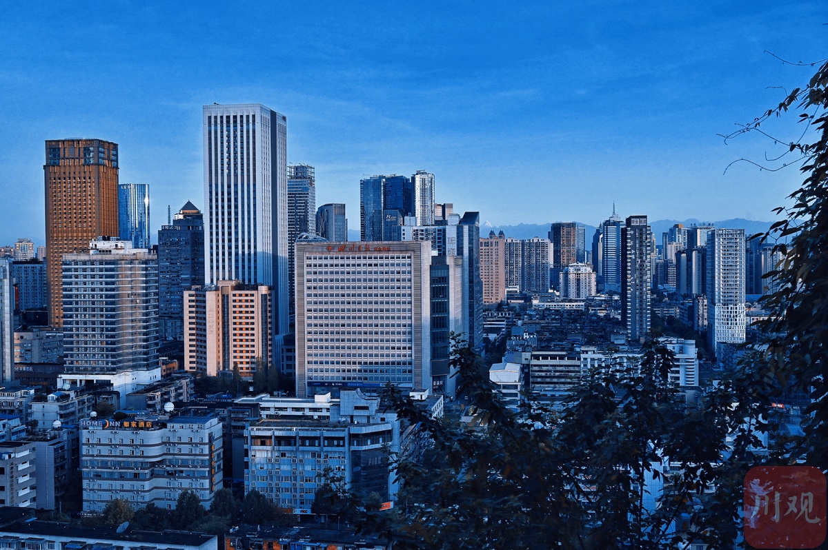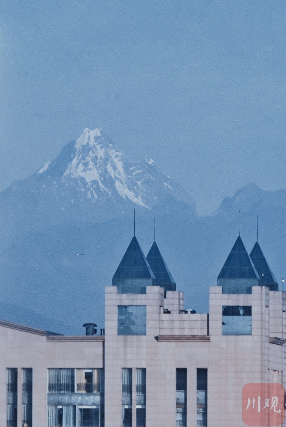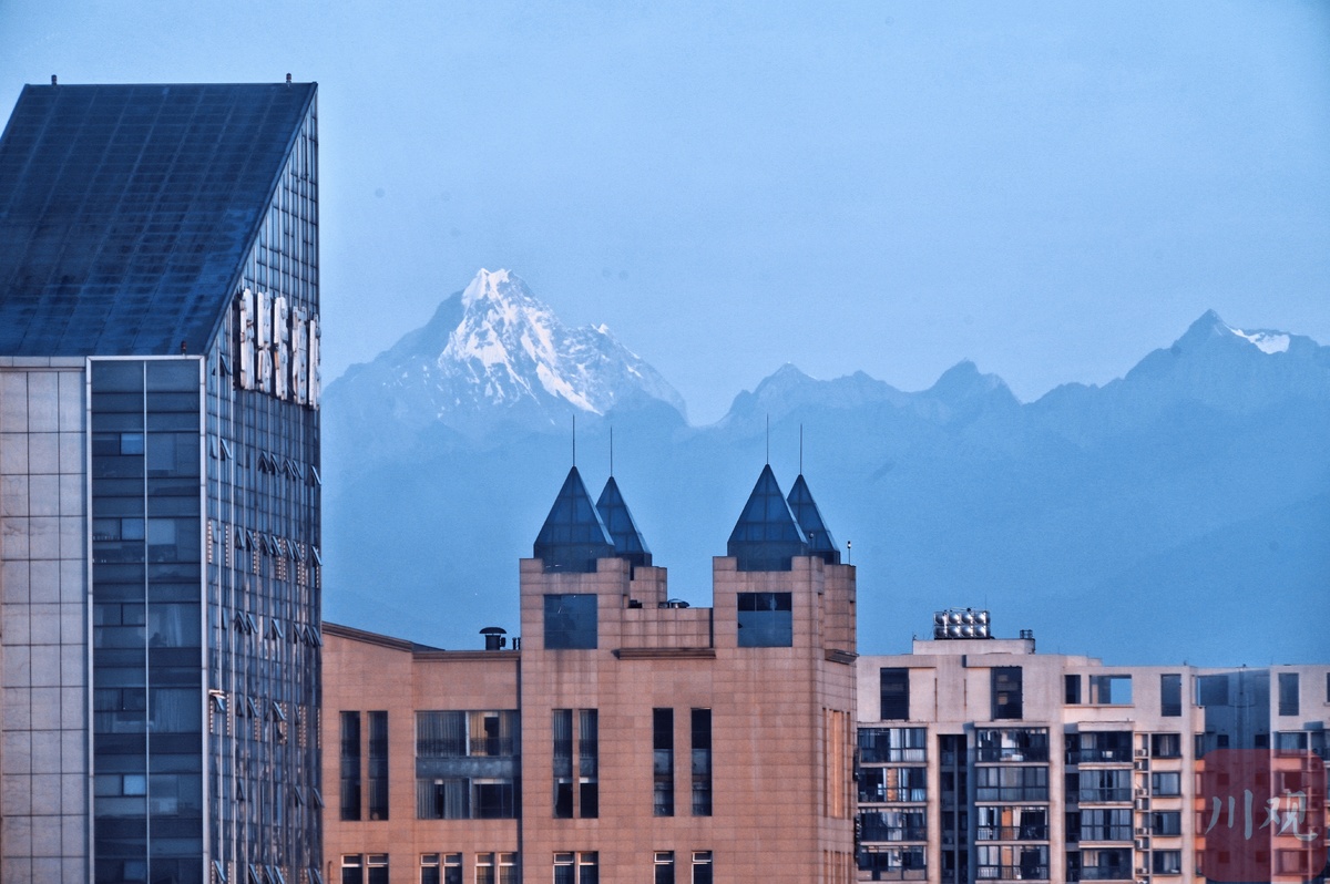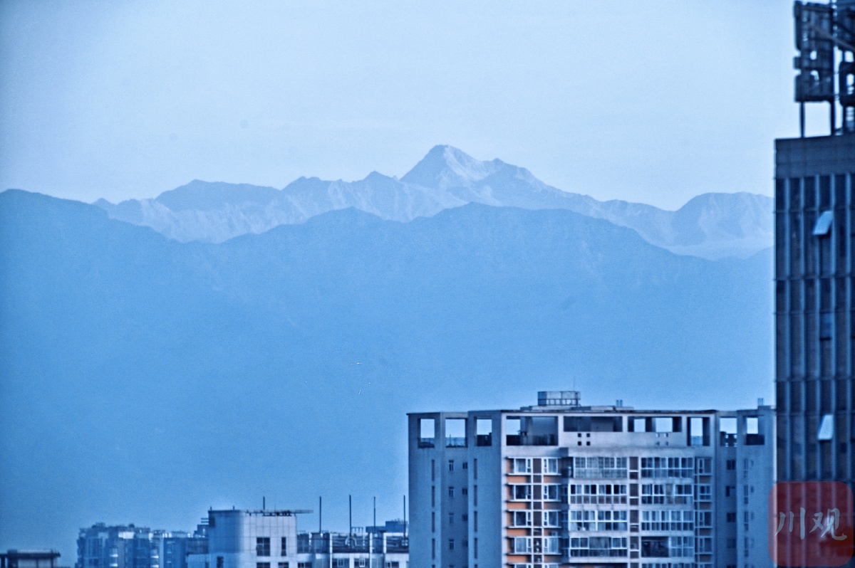 8月23日农历处暑,秋天正式到来,登高临风略感凉意。清晨,经过昨夜大雨的洗刷,成都市区的空气清透亮丽,极目远眺,视野极其辽远,远在百公里远的四姑娘山幺妹峰及山峦起伏的大雪塘清晰可见,似乎近在眼前,如此美景让观看者惊叹喜悦不已。