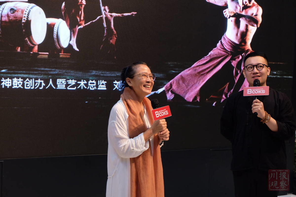 晚上七点半,台湾现代舞团“优人神鼓”创始人刘若瑀梳着一头花白的马尾,穿着一身麻制白色长衫,款款走上台前:“成都这个场地好有趣,长长的。”当晚在文轩BOOKS举办的《优人神鼓主创刘若瑀艺术分享会 ×静心体验》见面会就此开始。
