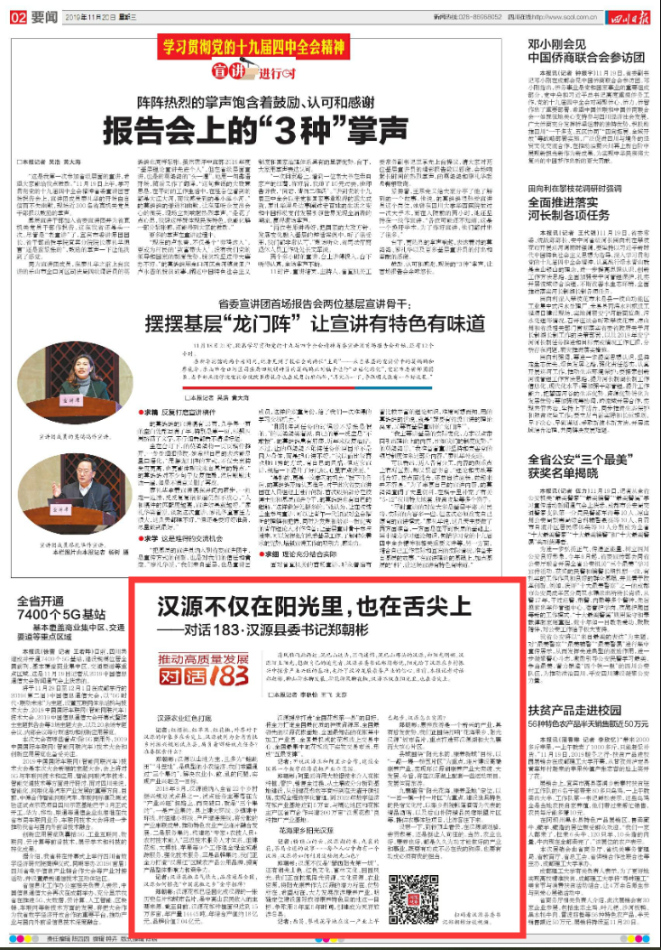 郑朝彬:感谢你对汉源的描绘,汉源不仅是“攀西阳光第一城”,还有湖光山色、红色文化、富林文化、田园风光。我们正在挖掘阳光资源、文化资源、农业资源,将阳光康养作为汉源的潜力所在、优势所在、希望所在,大力发展旅游康养产业,明确定位了建设国际旅游康养特色目的地的这一目标。争取用3至5年时间,创建成为天府旅游名县。