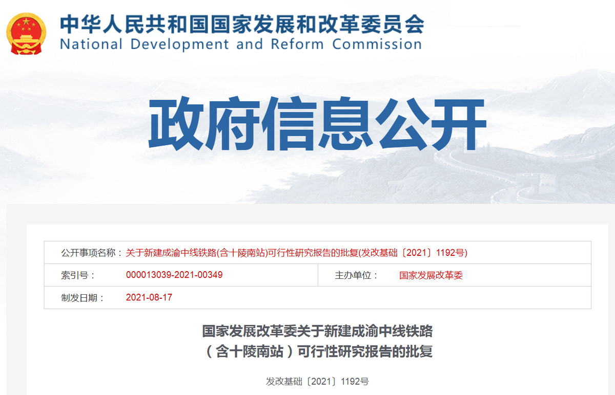 8月25日,川观新闻记者从国家发展改革委官网获悉,近日国家发展改革委正式批复新建成渝中线铁路(含十陵南站)可行性研究报告。