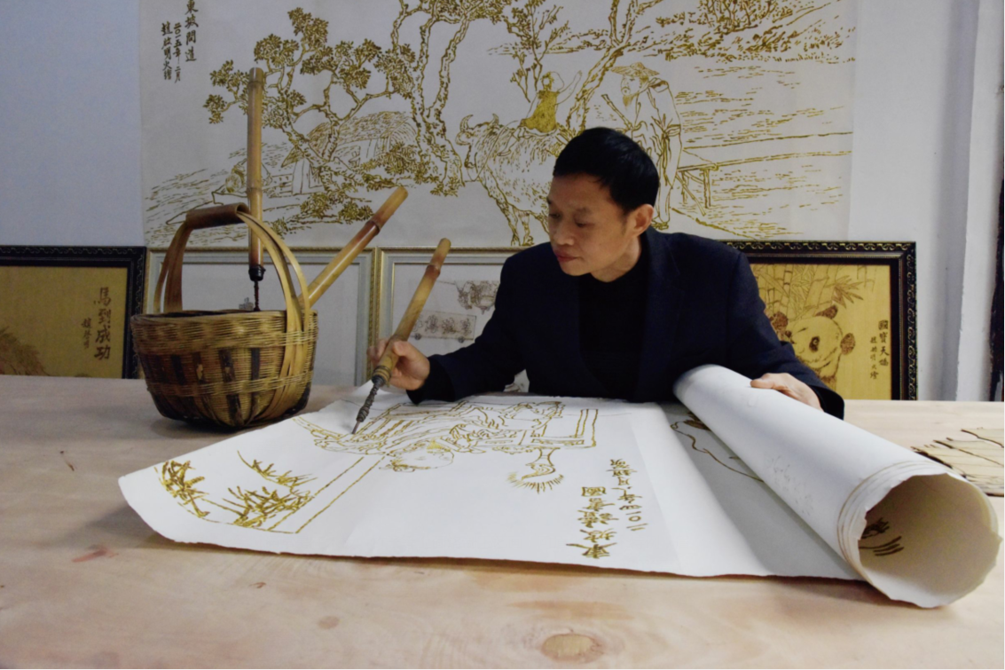 传统“火绘”通常是在木板、竹子等上面烙制工艺画,可眉山却有个特例,眉山市东坡区非物质文化遗产火绘艺术第四代传承人赵启明用烙铁在400℃高温下,能在极薄的宣纸上“铁笔妙手绘丹青”。