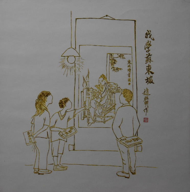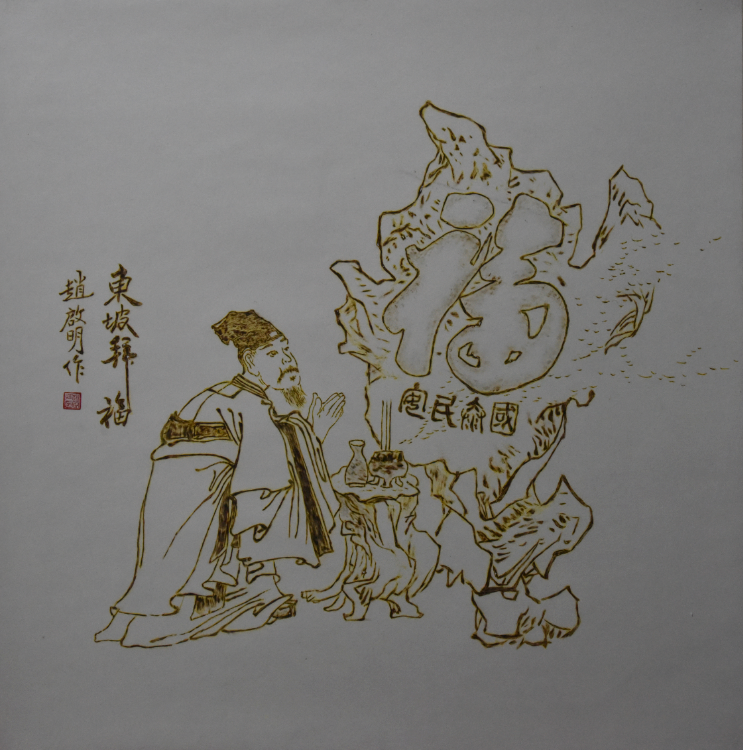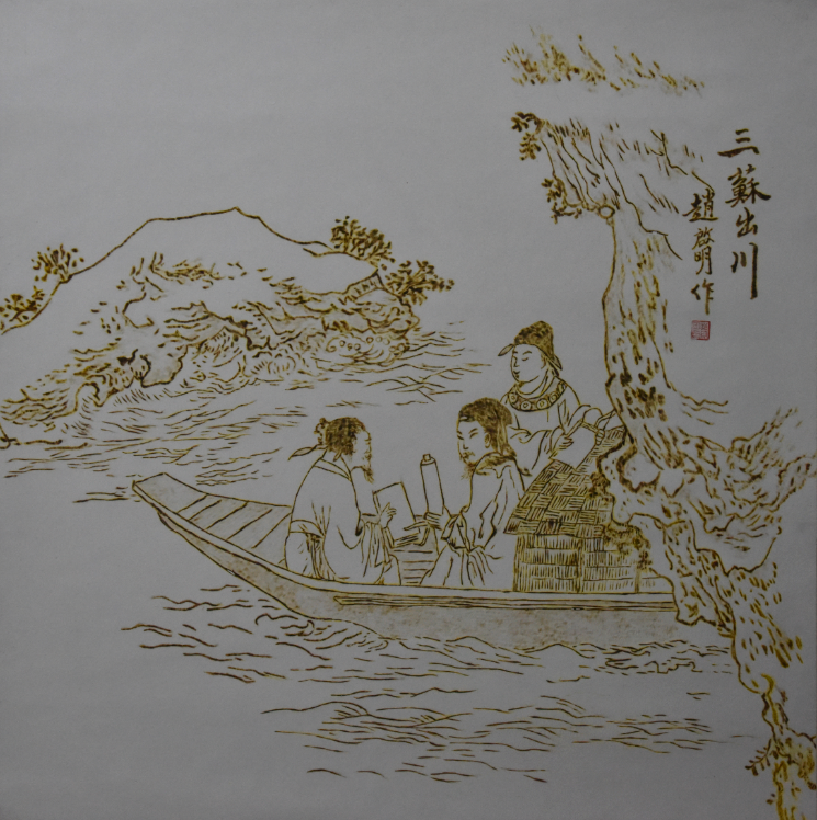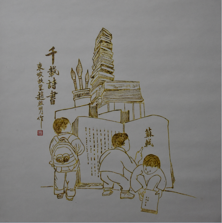 在赵启明众多火绘作品中,绝大多数都和东坡文化有关,《三苏图朱德诗》《满城诗书》《东坡玩砚图》《东坡寒食诗》……“三苏文化一直是眉山的骄傲,我也很喜欢三苏文化,苏东坡更是我的精神偶像。”赵启明说。