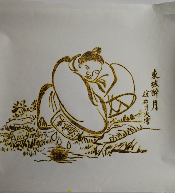 东坡火绘艺术是用铜或铁做成带木柄的铁笔,用木炭火或酒精火烧将笔头烧到适当温度后,在木、竹制品或土纸上绘制图画,其过程全部为手工完成,色泽层次丰富,典雅古朴。