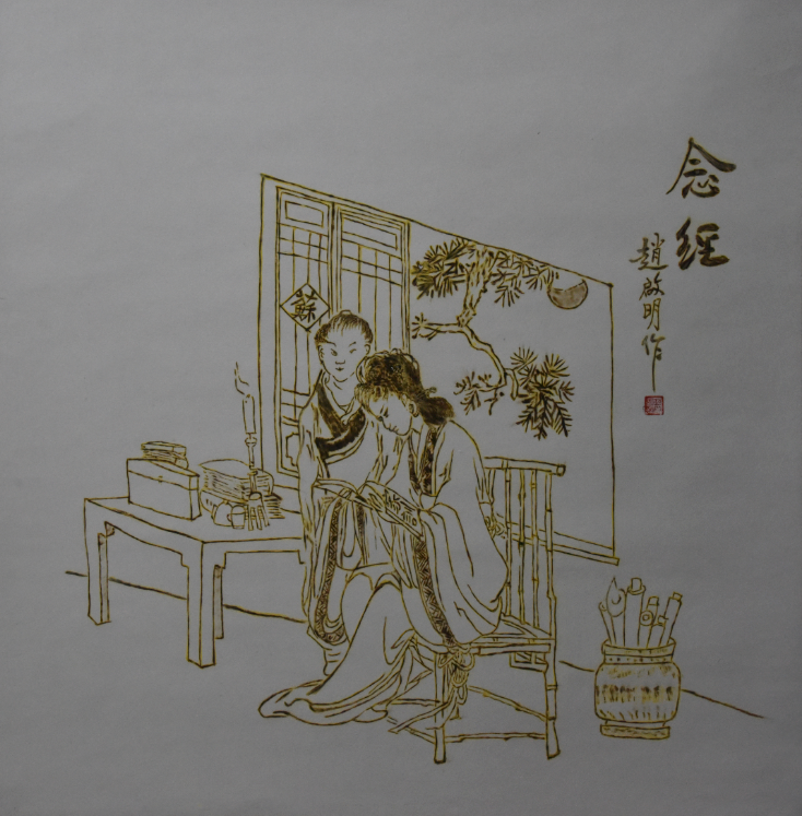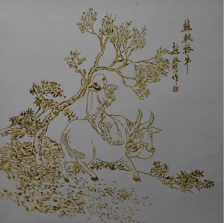 10多年前,勇于探索的赵启明开始尝试用烙铁首次在宣纸上进行火绘。“2000年,火绘木板画在纱縠北段致雅堂门市畅销,因周边县仁寿、夹江、青神等远处顾客反应携带不便,因此改用纸上烫画。” 谈及革新初衷,赵启明感慨万千。