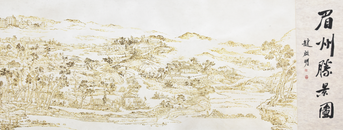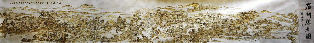 《眉州胜景图》,是一副长800厘米,宽130厘米的巨幅火绘,该画以千年东坡文化结合眉山全新的建设成就于一体。为创作此画,赵启明多次在岷东新区和眉山城区采风写生,历时近半年时间才创作完成。在近半年的创作时间中,赵启明几乎每天都画到半夜12点,全身心投入,都没顾得上其他事。