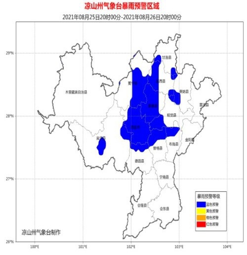 凉山州气象台也发布了暴雨蓝色预警:预计25日傍晚到26日白天,凉山州有一次强降雨天气过程,雨量普遍为中到大雨,其中西昌市、盐源县、德昌县、普格县、布拖县、昭觉县、喜德县、冕宁县、越西县、甘洛县、美姑县的部分乡镇有暴雨,个别乡镇有大暴雨,本次天气过程可能伴有短时强降水、雷暴、短时阵性大风等强对流天气。