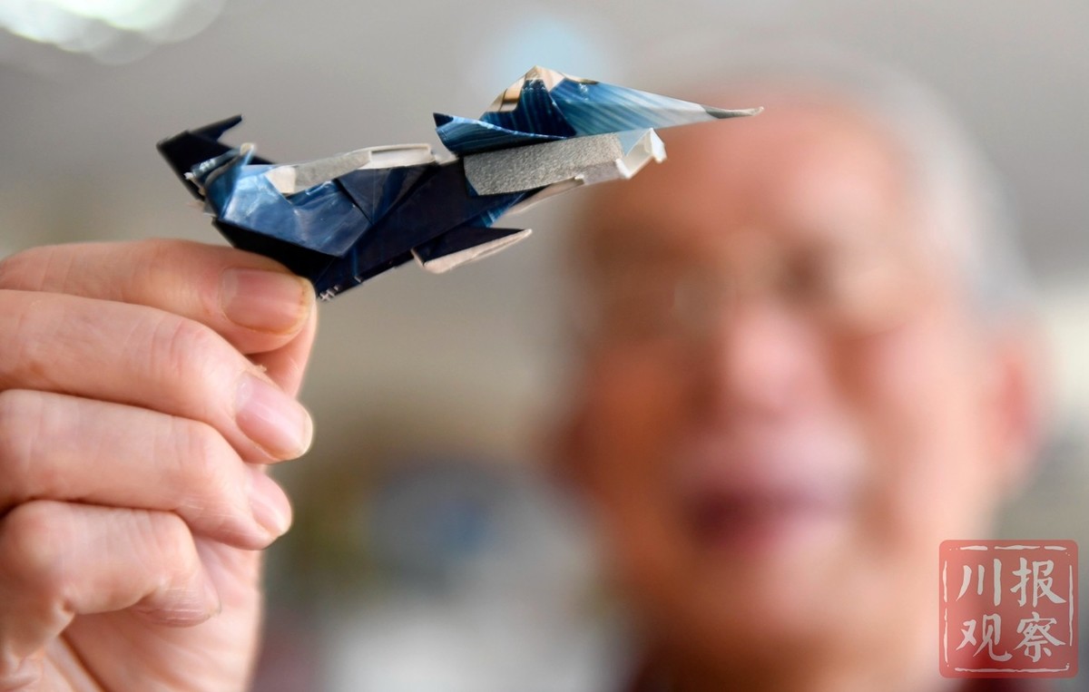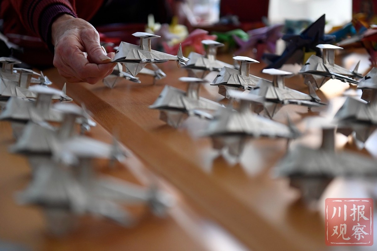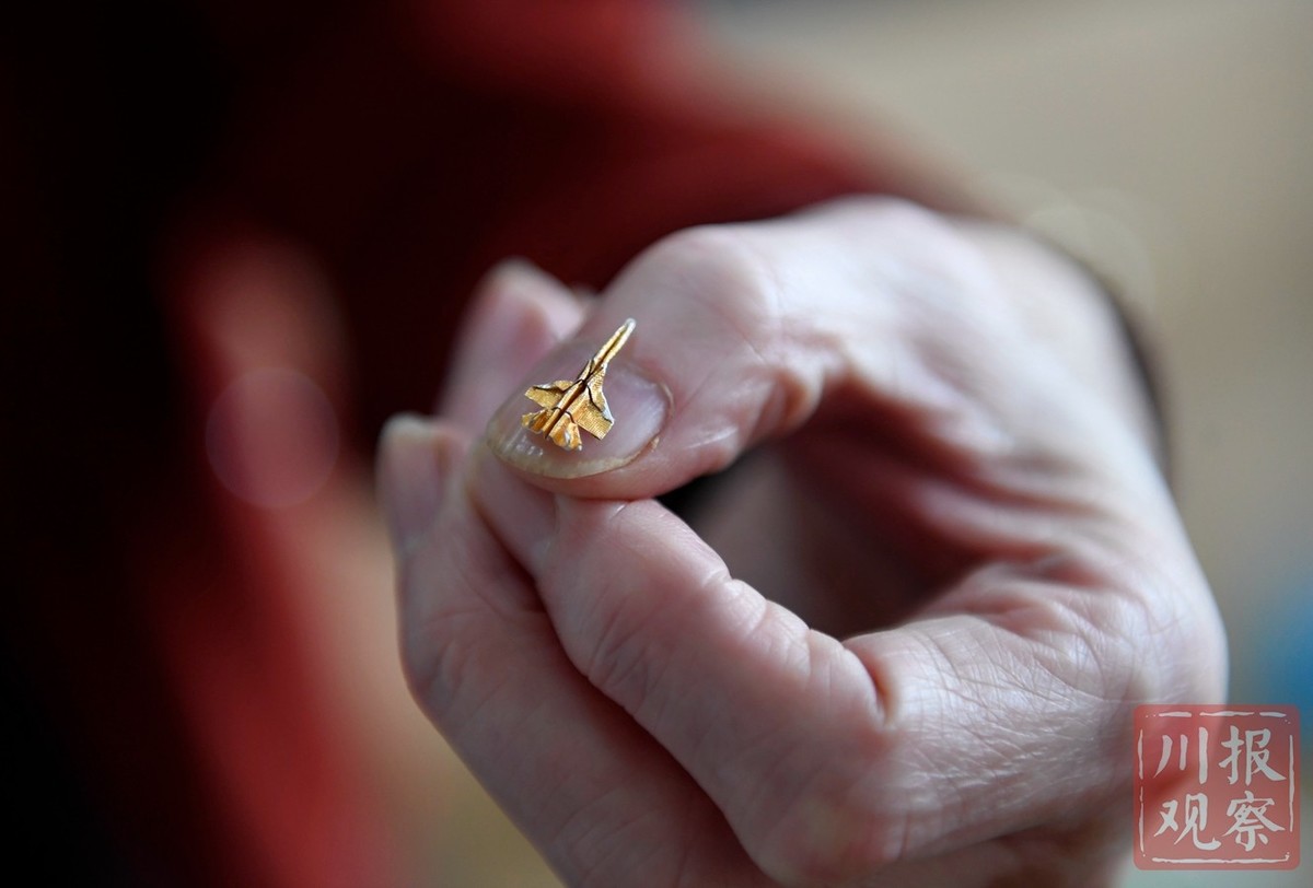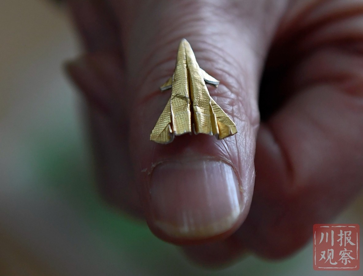 60多年来,许树全通过实物、图片、杂志等多种渠道已经掌握了近二十款国产战机外形和民用飞机的折法,至今已折出了上万架纸飞机编队,最小的纸飞机袖珍到没有指甲盖大。