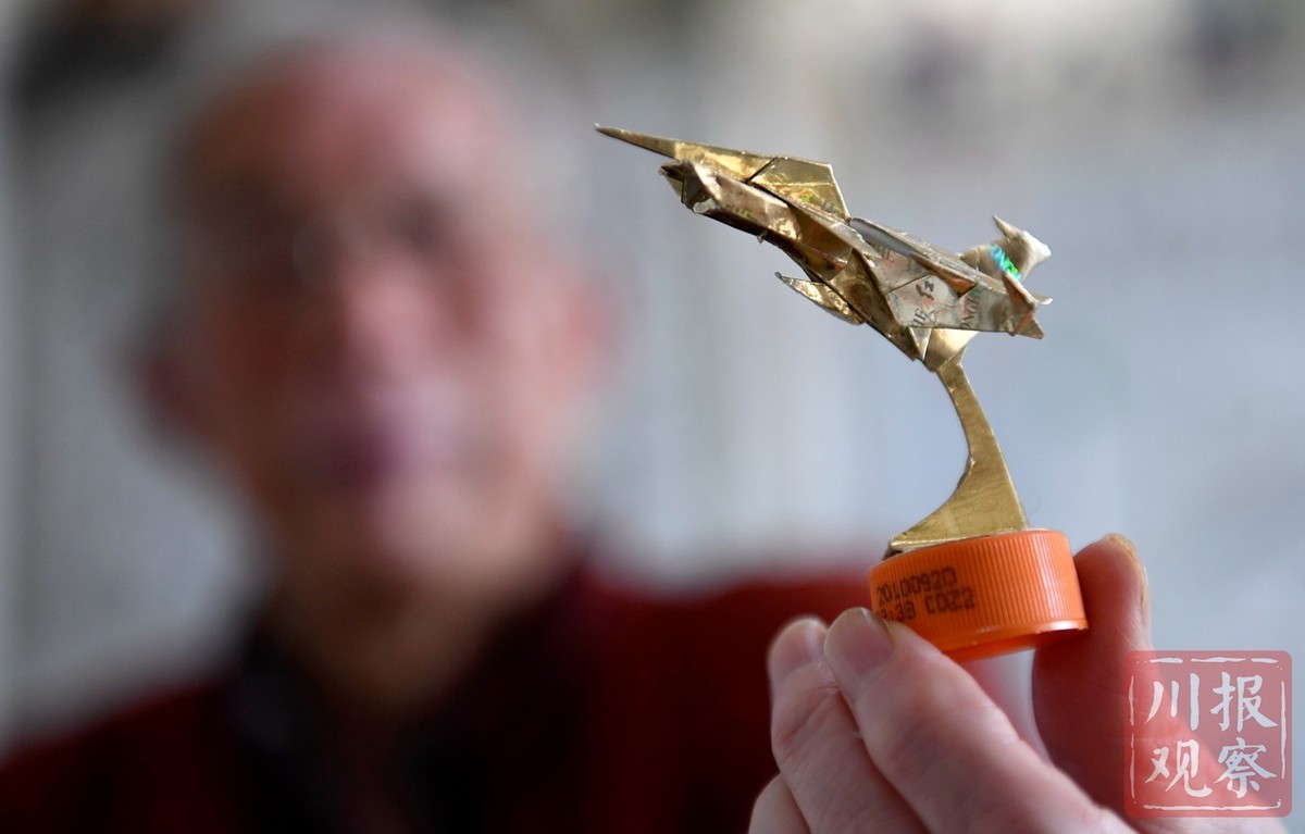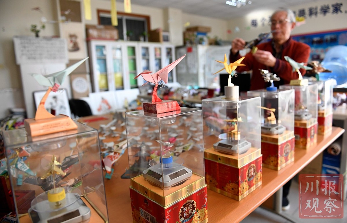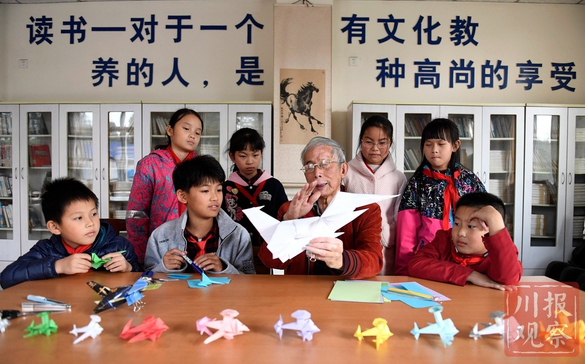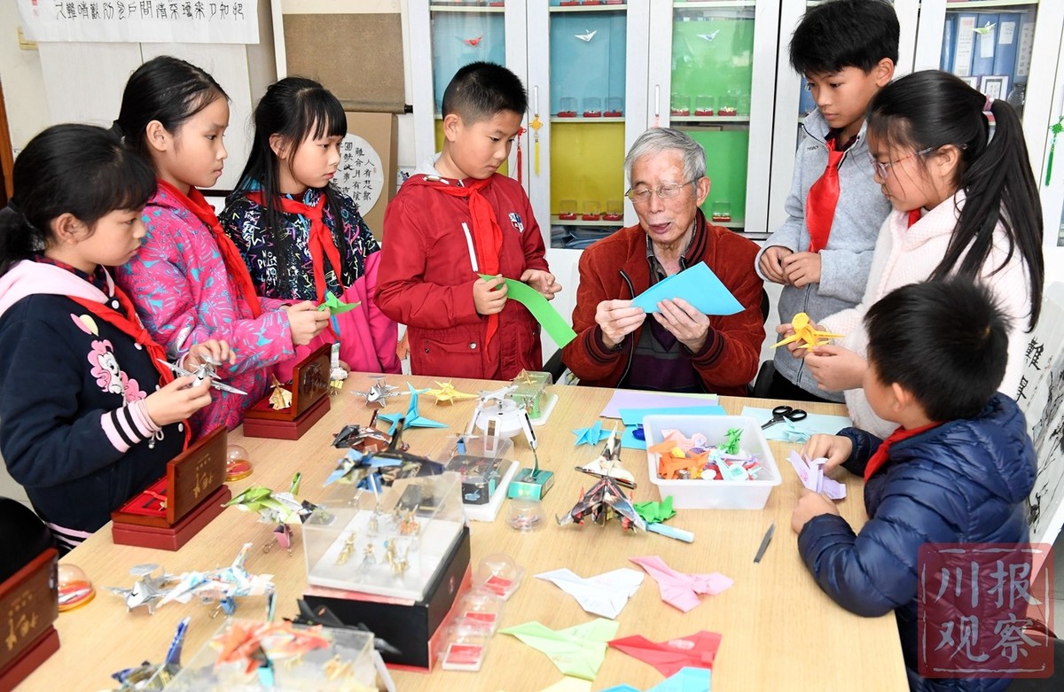 废旧的杂志、烟盒、月饼盒、牛奶盒、广告纸……11月6日,在成都成飞小学纸飞机手工展览室里,通过75岁退休教师许树全的双手,几分钟的功夫,一架趣味性纸飞机就折好了。