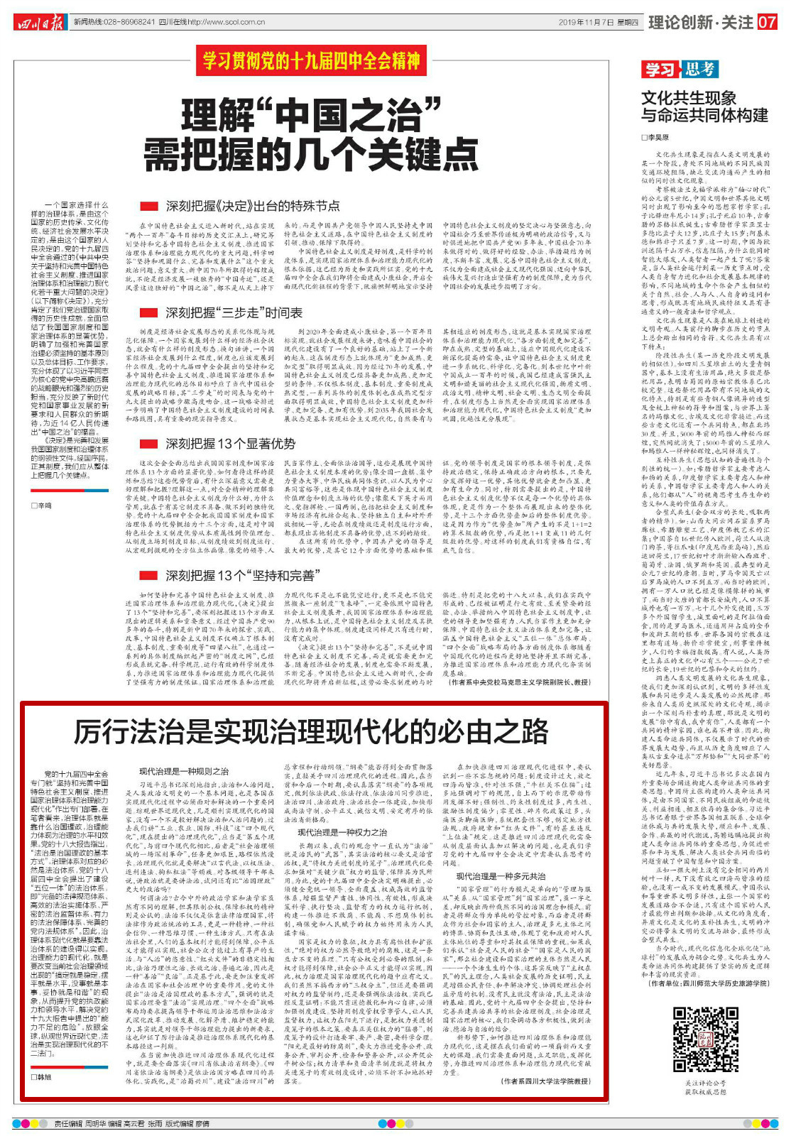 新形势下,如何推进四川治理体系和治理能力现代化,这是摆在我们面前的一项崭新而又重大的课题。我们需要直面问题,立足职能,发挥优势,为推进四川治理体系和治理能力现代化贡献力量。(作者系四川大学法学院教授)