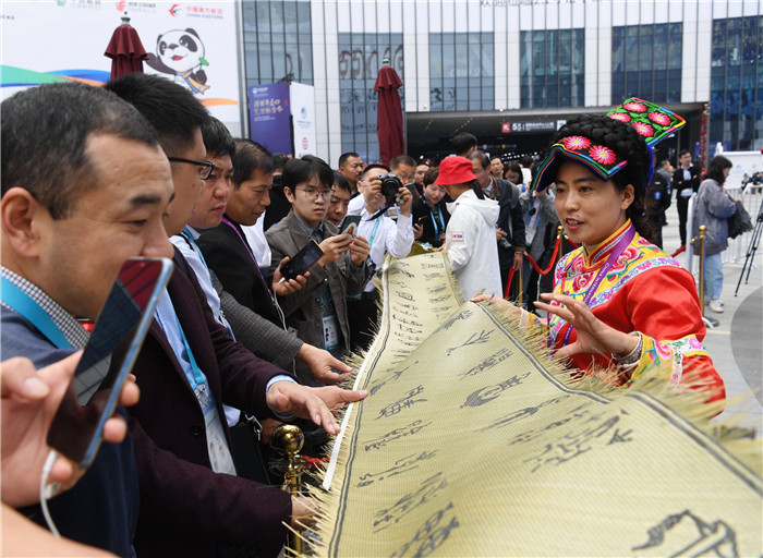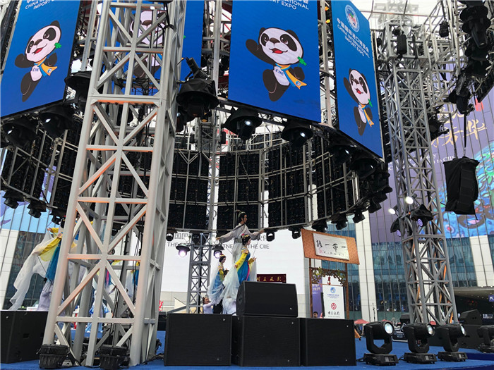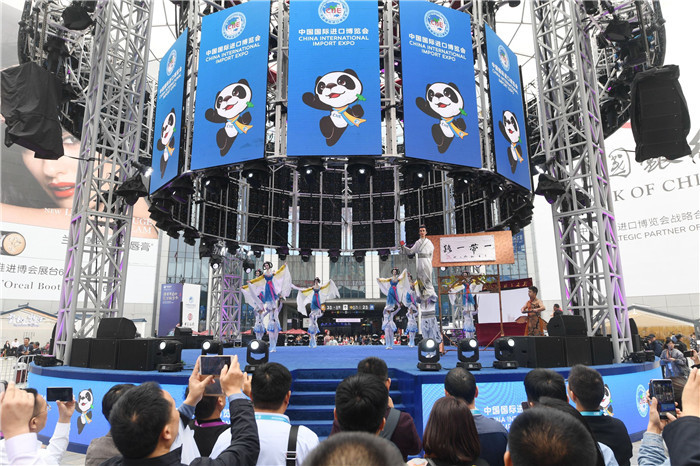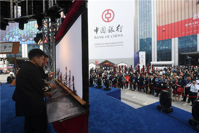 11月7日中午12时30分,第二届中国国际进口博览会展馆的中心广场,四川三项非物质文化遗产项目的现场表演引来台下阵阵掌声。