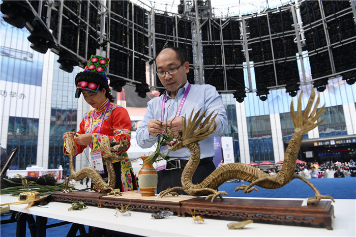 羌族草编传统技艺非遗项目代表性传承人黄强则带来了“草编百家姓图腾”等作品,并在现场进行了展示。“这个图腾为5人花费3月时间制作完成。虽是草编产品,但通过我们特有的工艺进行了处理,可以长期保存。”他说。