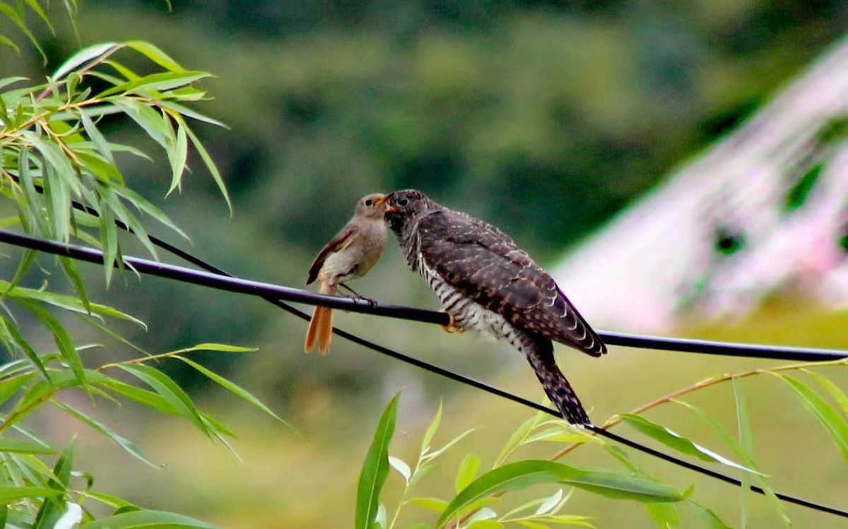 据达乐观察,这只小巧的赭红尾鸲喂养体型比它大几倍的雀鹰(鹞子)已经很长一段时间了,会时不时特意叼着食物,来看望雀鹰,生怕雀鹰受饿,两只鸟儿相处十分愉快。“看来赭红尾鸲是把雀鹰当成自己的‘崽儿’了。”达乐说。