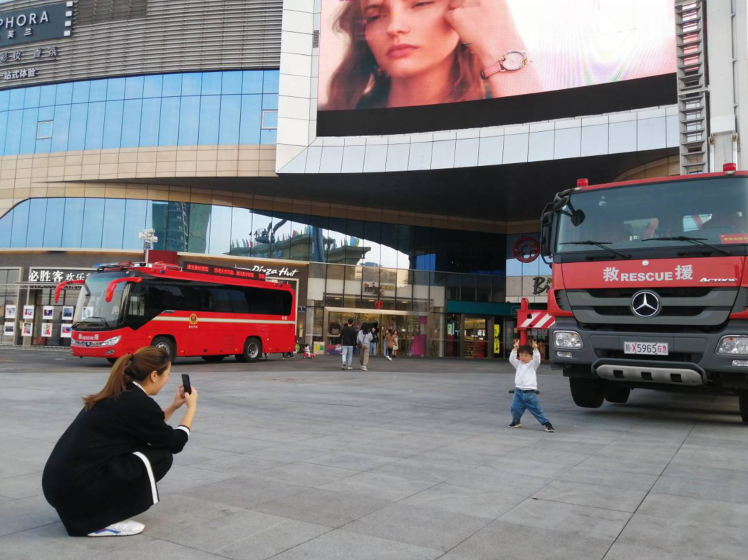 “我看消防”,装备展示。6辆特色消防车(水罐车、抢险车、举高车、餐车、淋浴车、宣传车)、部分救援器材、通信器材。