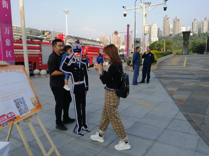 广场上,游园活动的各个点位正在紧张有序的布置中,不少路过的市民朋友遍已迫不及待地抢先体验起来。人气最高的属消防形象露头拍照板,路过的人们都忍不住往拍照板后一藏,给一个个帅气的消防形象换上自己的脸。