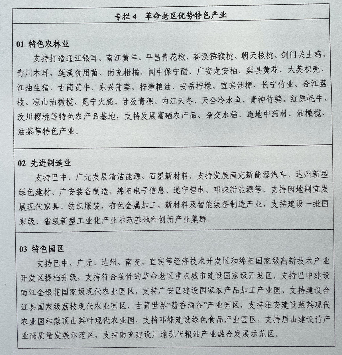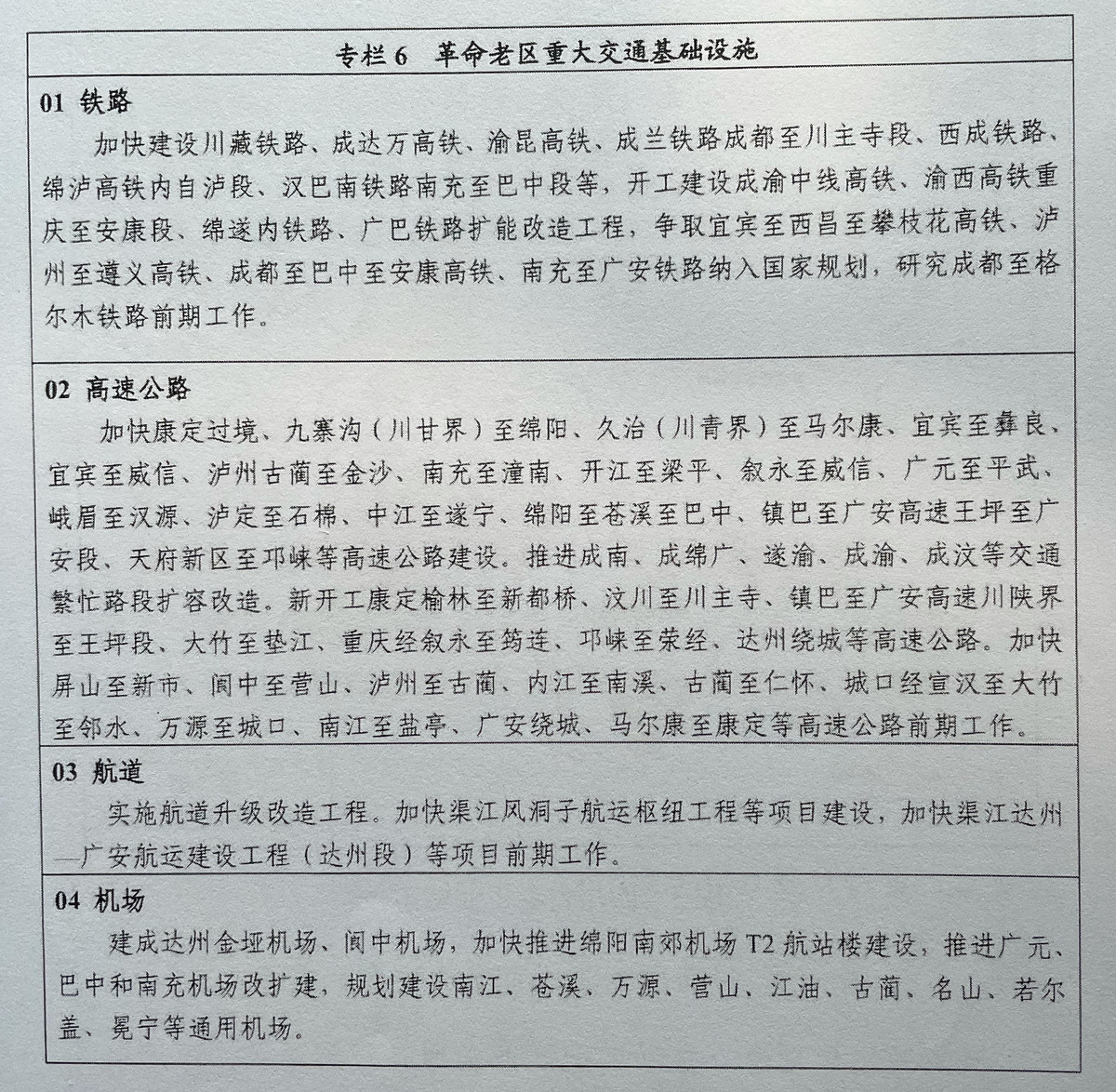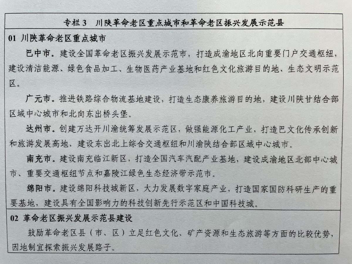 上述人士透露,省委省政府历来高度重视革命老区振兴发展,省委十一届三次全会提出构建“一干多支、五区协同”的区域发展新格局,革命老区作为重点区域进行部署。川陕革命老区5个市:巴中、广元、达州、南充、绵阳,除绵阳外,其余4个市都属于川东北经济区,发展“多支”中提到,打造各具特色的区域经济板块,推动川东北经济区等竞相发展。
