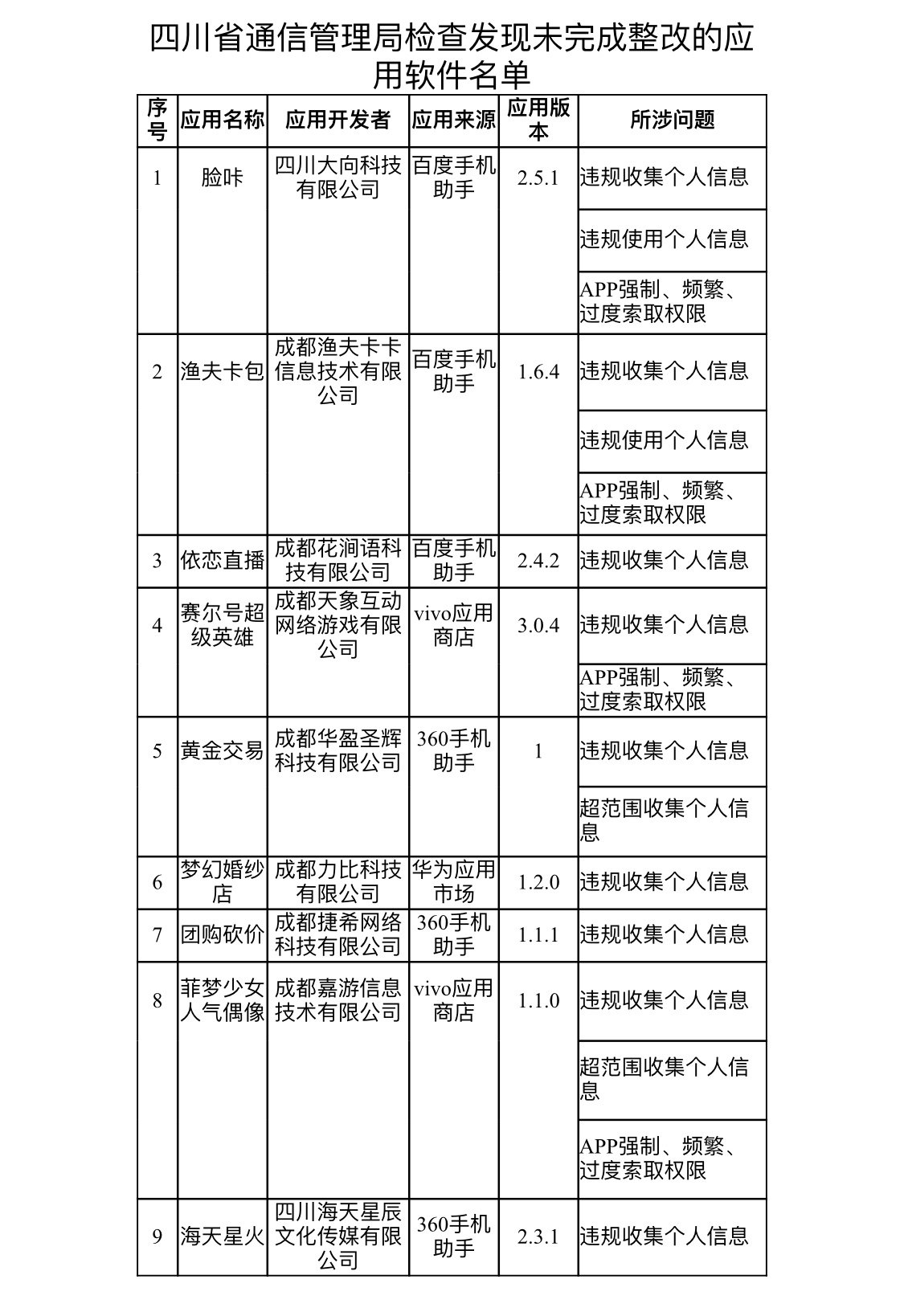 依据《网络安全法》《电信条例》《电信和互联网用户个人信息保护规定》等法律法规,按照《关于开展纵深推进APP侵害用户权益专项整治行动的通知》(工信部信管〔2020〕164号)工作部署,省通信管理局近期组织第三方检测机构对203款手机应用软件开展检测工作,其中11款APP存在“违规收集个人信息”、“超范围收集个人信息”、“APP强制、频繁、过度索取权限”、“强制用户使用定向推送功能”等相关问题,四川省通信管理局已书面要求问题APP相关企业限期整改。