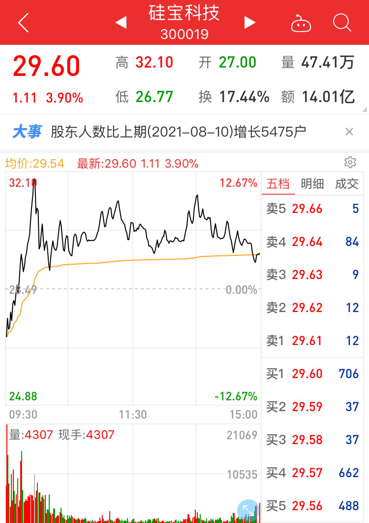 8月26日,硅宝科技自开盘一路走高,盘中股价创历史新高报32.10元/股,随后涨幅略有回落,截至收盘,硅宝科技报29.60元/股,较前一交易日上涨3.90%。