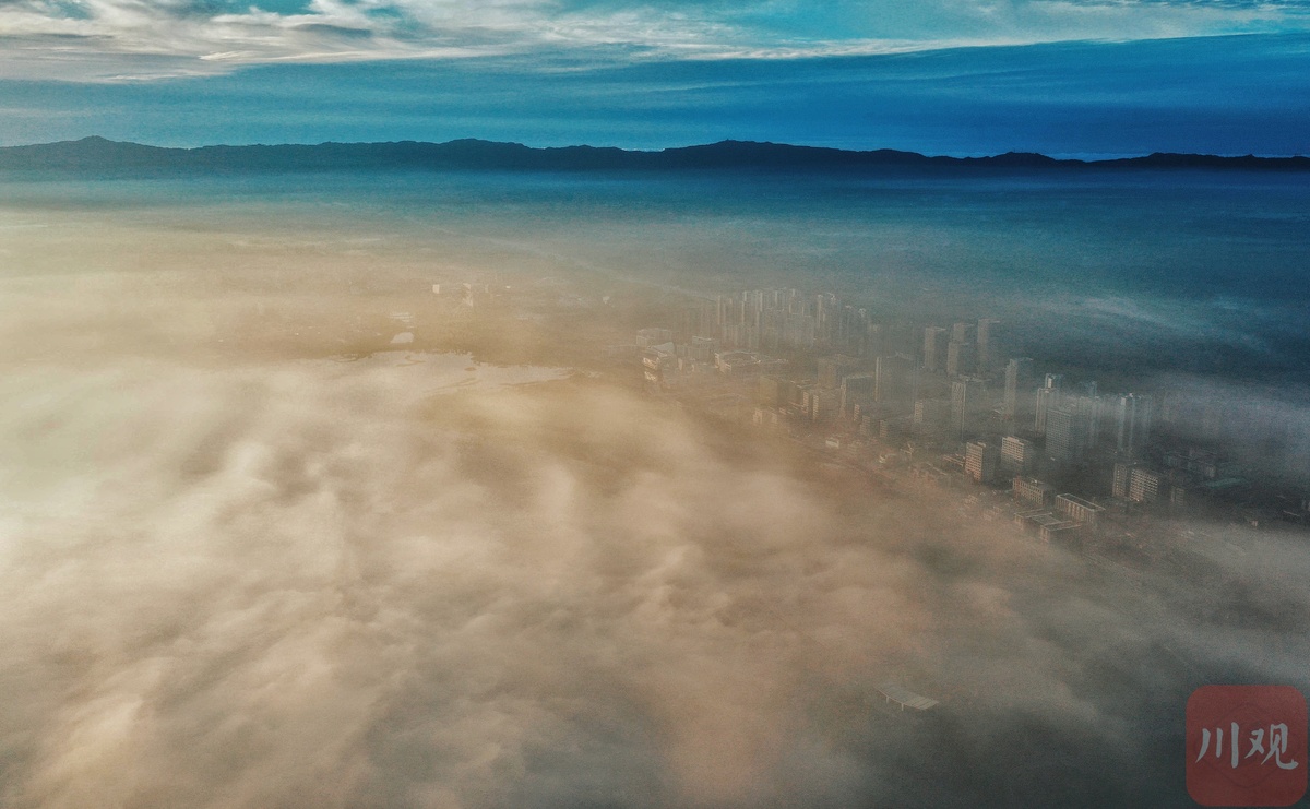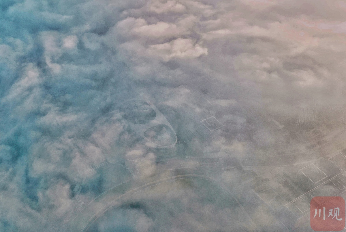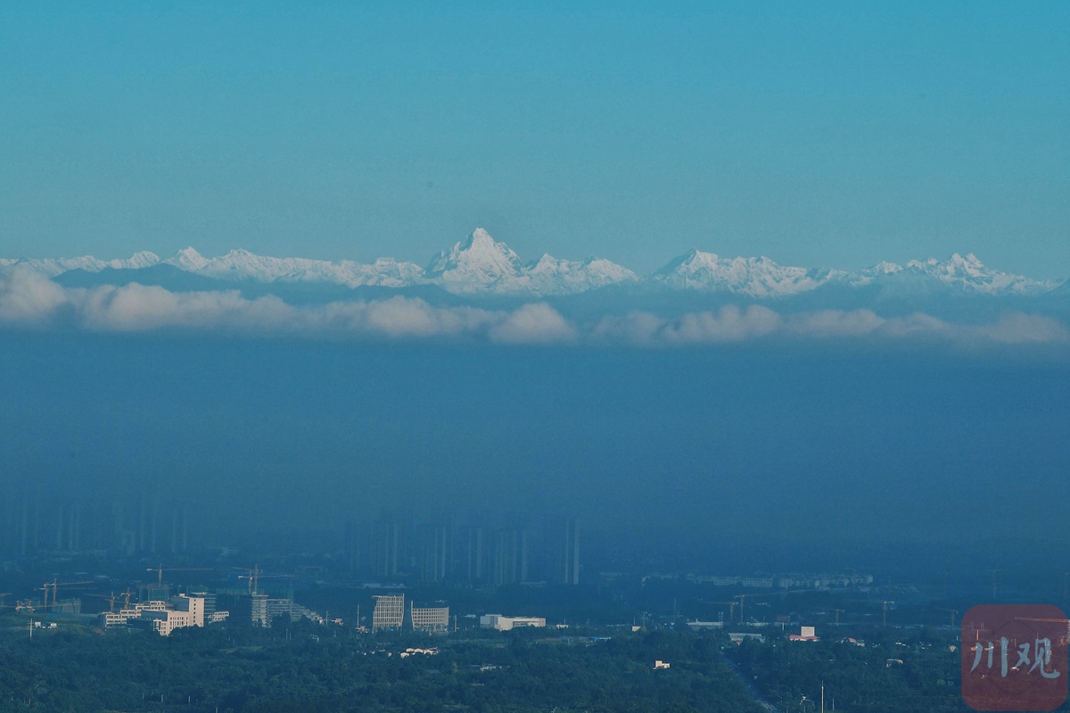 8月27日清晨,成都天府新区科学城上空在雨后出现了平流雾现象,远远望去如同仙气飘绕。穿过轻纱般的薄雾,镜头直击雾气蒸腾的云层上,远在100公里外的雪山清晰可见。此外,今日在天府新区内的龙泉山城市森林公园内也能眺望到雪山群的美景。