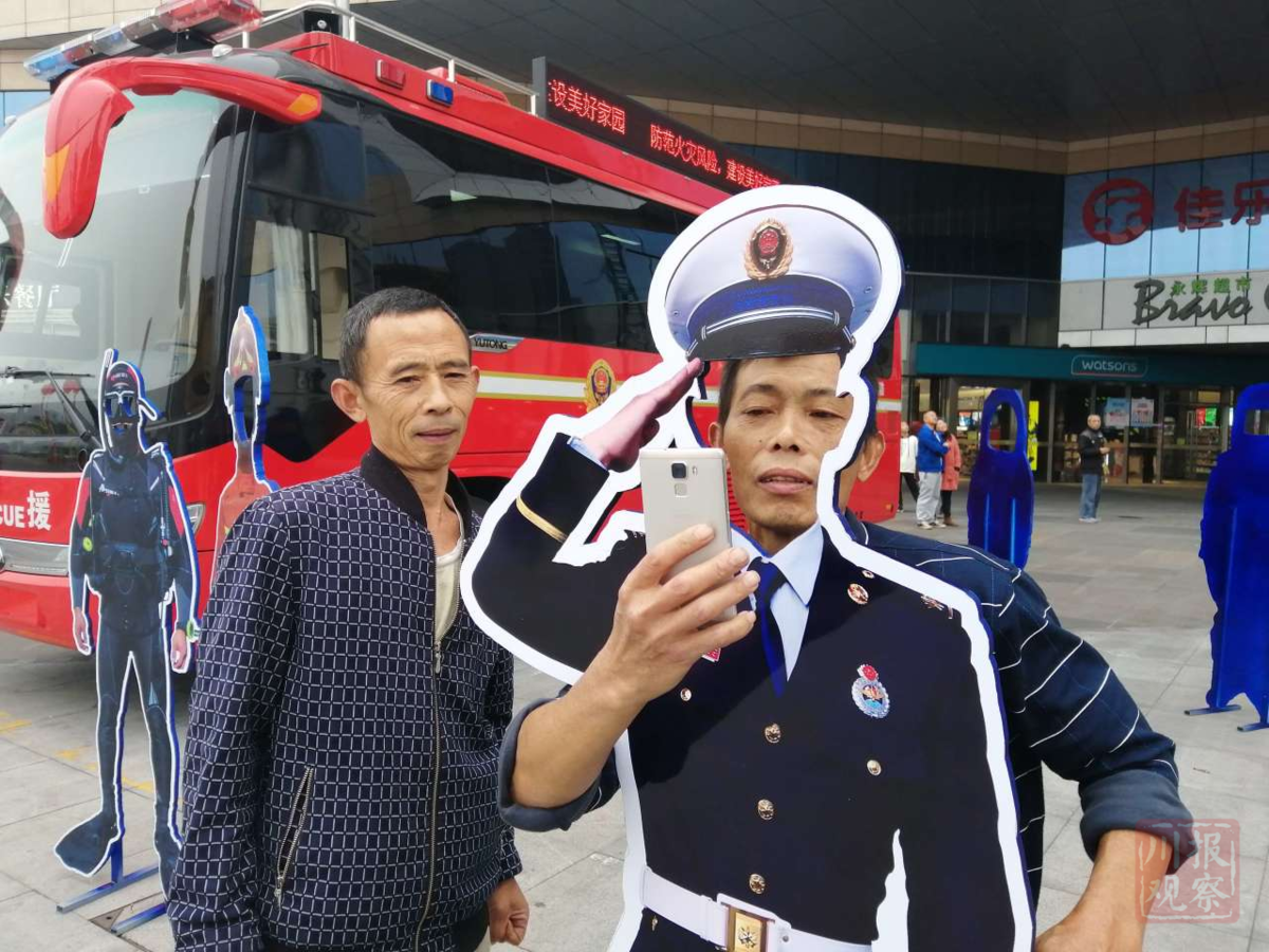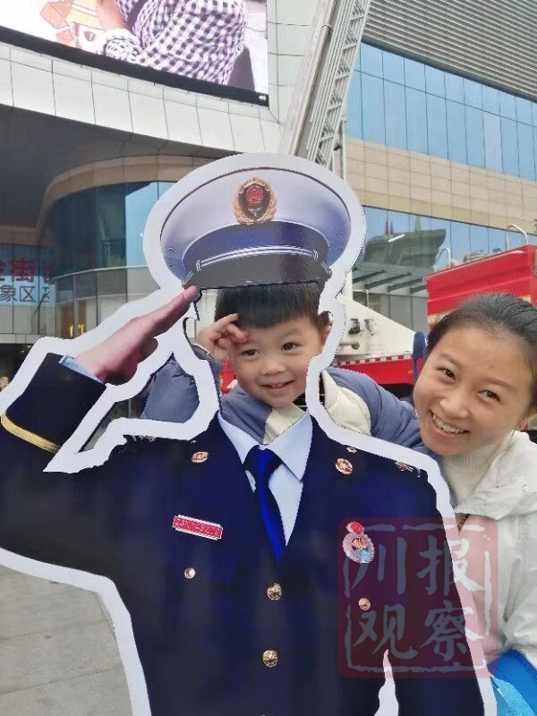 在“我有消防”拍照集赞活动最受亲子组合的青睐,9种不同的消防员服装形象板直立围成一圈,有消防灭火防护服、抢险救援服、轻型防化服、避火服、隔热服等,路过的人们都忍不住往拍照板后一藏,给一个个帅气的消防形象换上自己的脸。