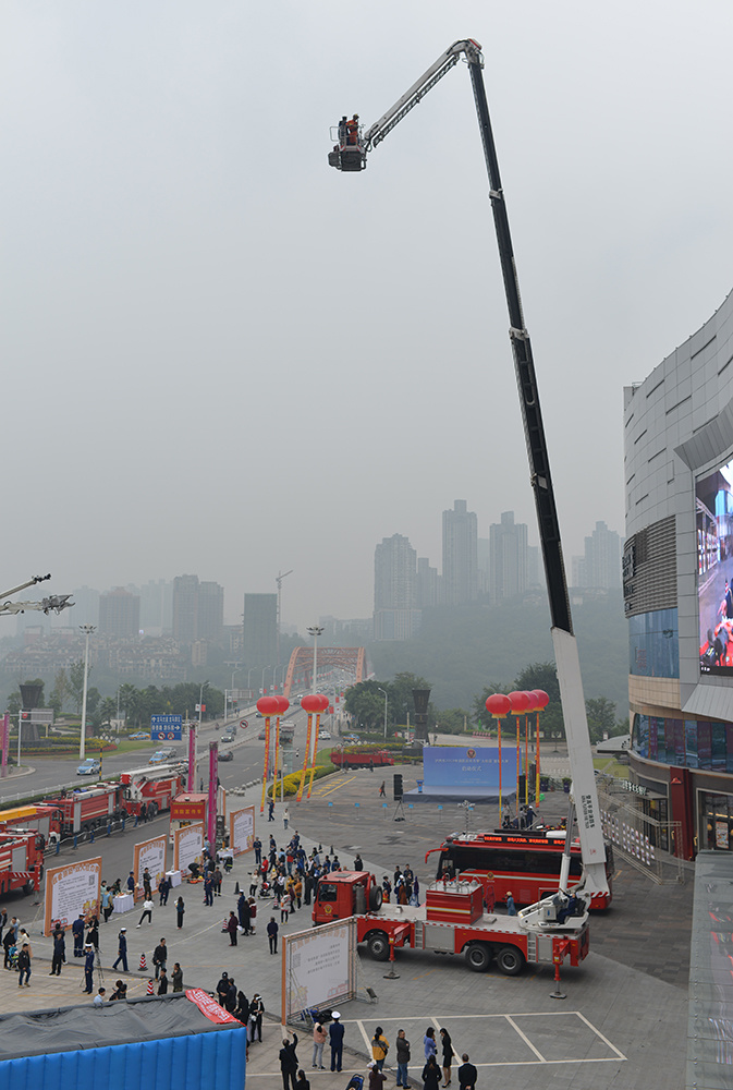 活动现场,泸州消防把全泸州最大的一台登高平台消防车开到了现场,消防员熟练地操作平台,一分多钟就将5名成年人送上近60米高的高空平台上。