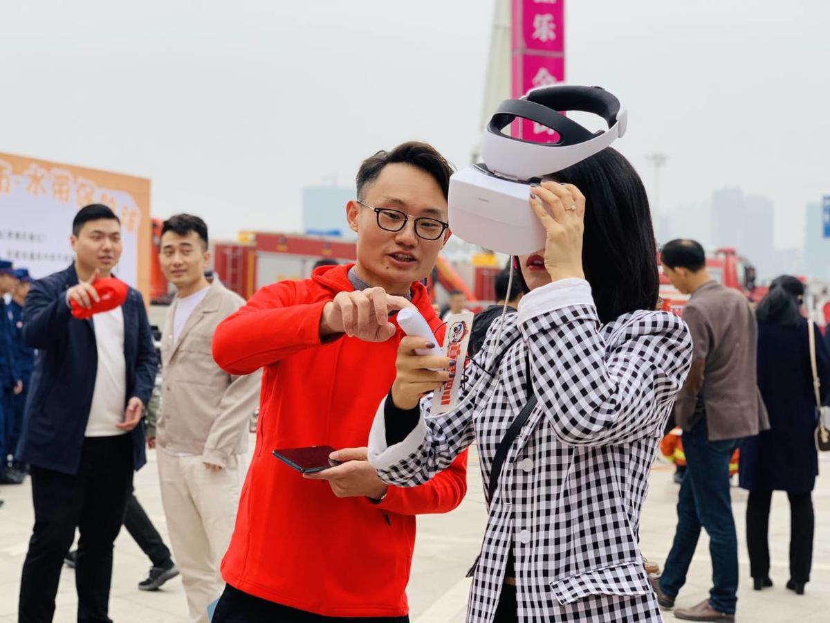 除了5G直播,泸州电信以5G+智慧消防为主题,提供了5G+VR、烟雾探测报警器等设备,引来了不少市民的围观。不少市民还在泸州电信工作人员的指引下,戴上5G +VR头盔,拿着手柄,在现场就享受了一把VR带来的沉浸式体验。刚刚体验完VR的市民刘先生笑着告诉记者,“第一次体验5G+VR,画面清晰流畅也很真实,按动着手柄就可以播放视频、音乐,有一种身临其境的感觉。”