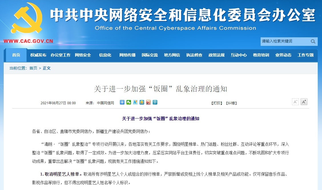继今年6月15日开展为期2个月的“清朗·‘饭圈’乱象整治”专项行动之后,中央网信办又于8月27日发布了《关于进一步加强“饭圈”乱象治理的通知》(以下简称《通知》),对“饭圈”的治理升级。这既是巩固之前的治理成果,又是将治理推向制度化、常态化。