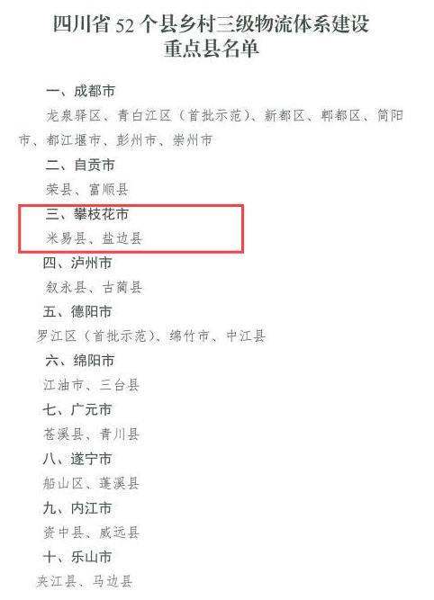 近日,省邮政管理局联合省交通运输厅明确,按照目标规划,将在明年12月前,打造52个县乡村三级物流体系建设重点县,攀枝花市米易县和盐边县成功入选。