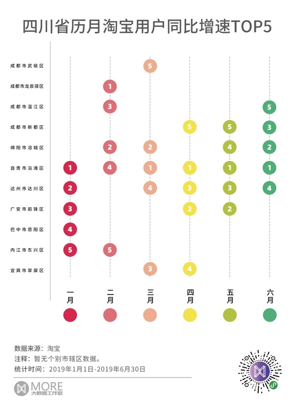 2019年上半年,四川省47个市辖区中,淘宝用户数量最多的五个区为:武侯区、(乐山市)市中区、金牛区、成华区、锦江区。作为新一线城市的成都,在互联网消费领域呈现出独占鳌头的气势。然而,非成都市所辖区县淘宝用户数量的高速增长,也给四川省互联网消费生态带来了新的惊喜,消费下沉趋势日渐凸显。