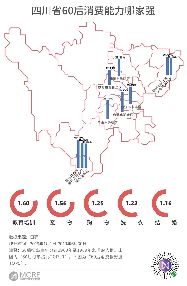 教育培训、宠物和购物是四川省60后消费的三大“心头好”。60后伴随改革开放成长,消费习惯较50后更现代化。不委屈自己、愿意为生活品质花钱、注重精神文化需求是四川60后消费的一大特点。
