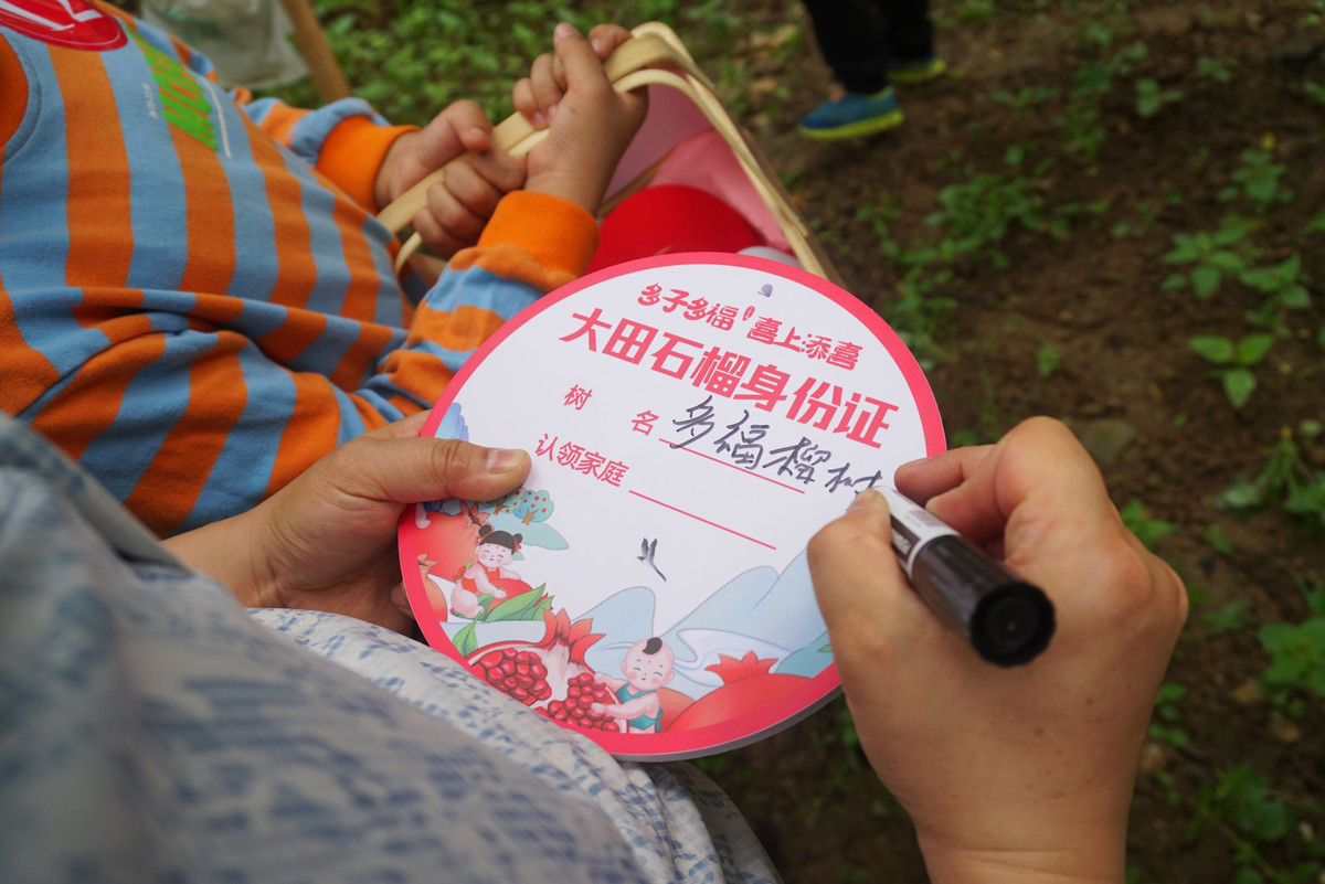 “家人经常在外地工作,两个孩子年龄相差也比较大,今天的活动对于我们家来说意义非凡,大家就像过年一样聚在一起。”参加活动的廖国良为认领的果树挂上了大田石榴身份证,“我的两个小孩的名字里都有‘睿’,所以我们认领的树叫‘祥睿’,希望他们长大以后吉祥如意、聪明睿智。”