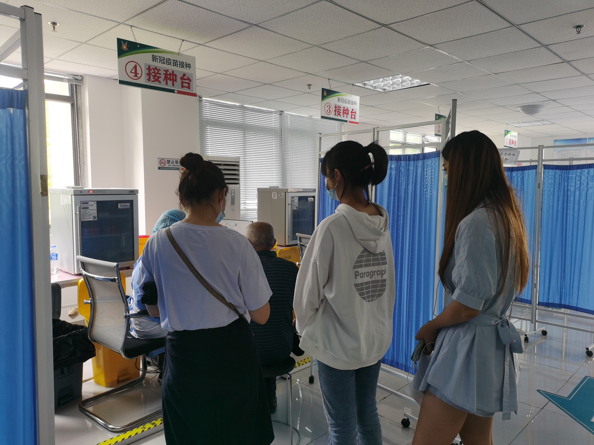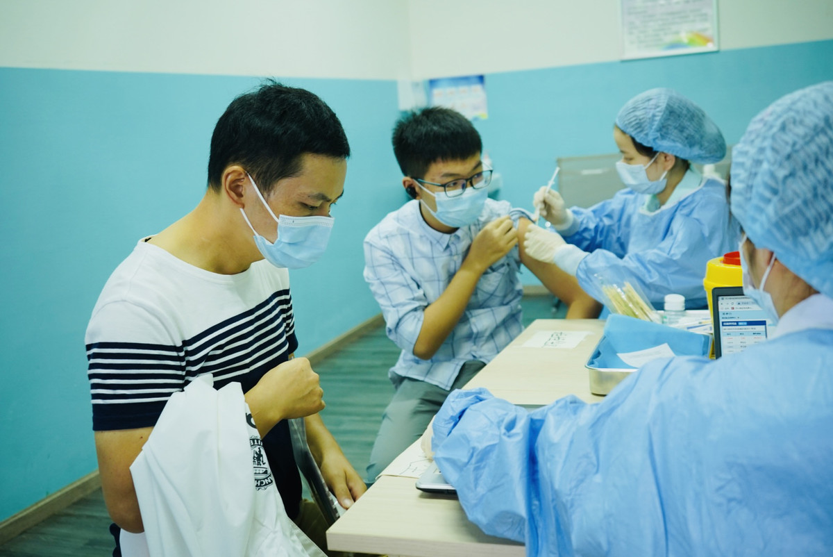 8月29日,万年场街道新冠疫苗接种点,医护人员正在为未成年人接种。魏冯摄。