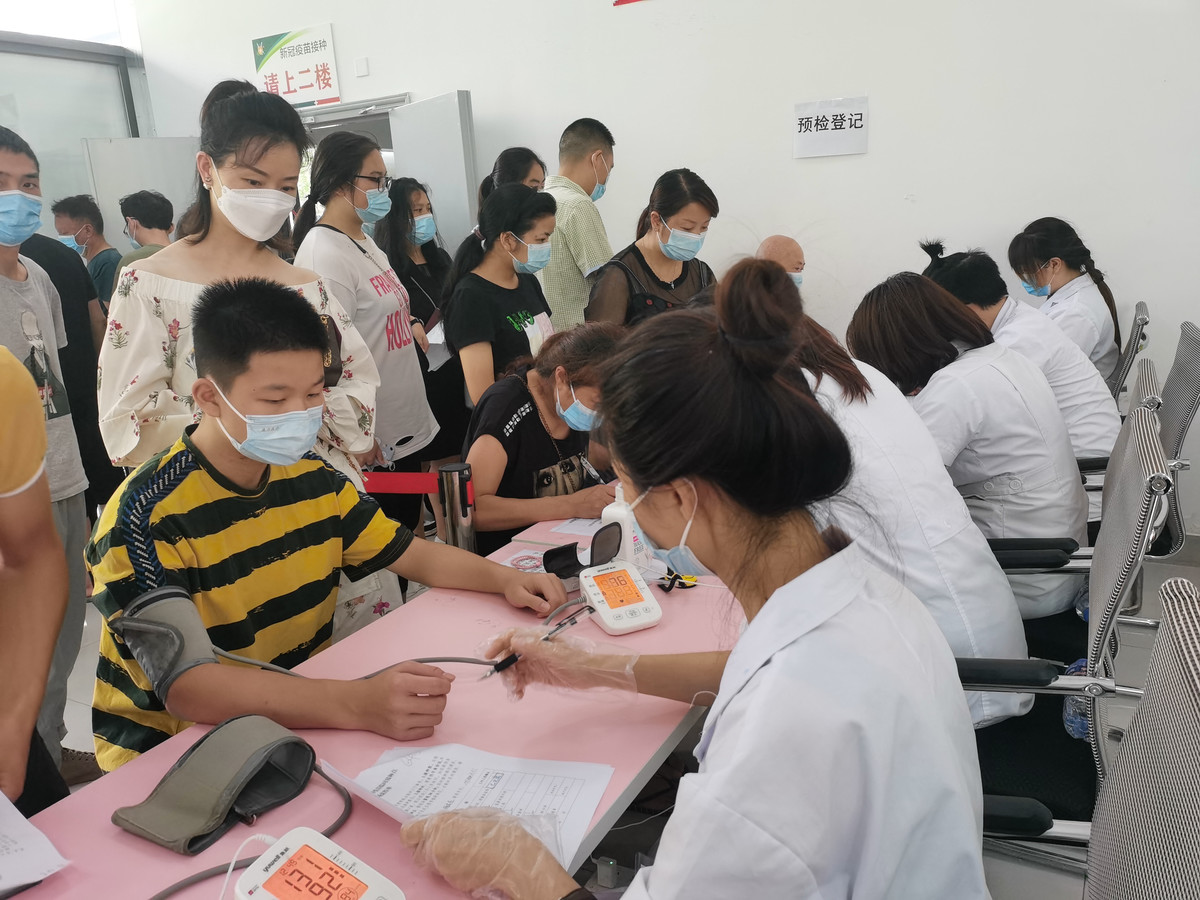 锦江区三圣街道新冠疫苗接种点,医护人员正在为成都树德中学(外国语校区)的孩子们进行预检登记。锦江区三圣社区卫生服务中心供图。