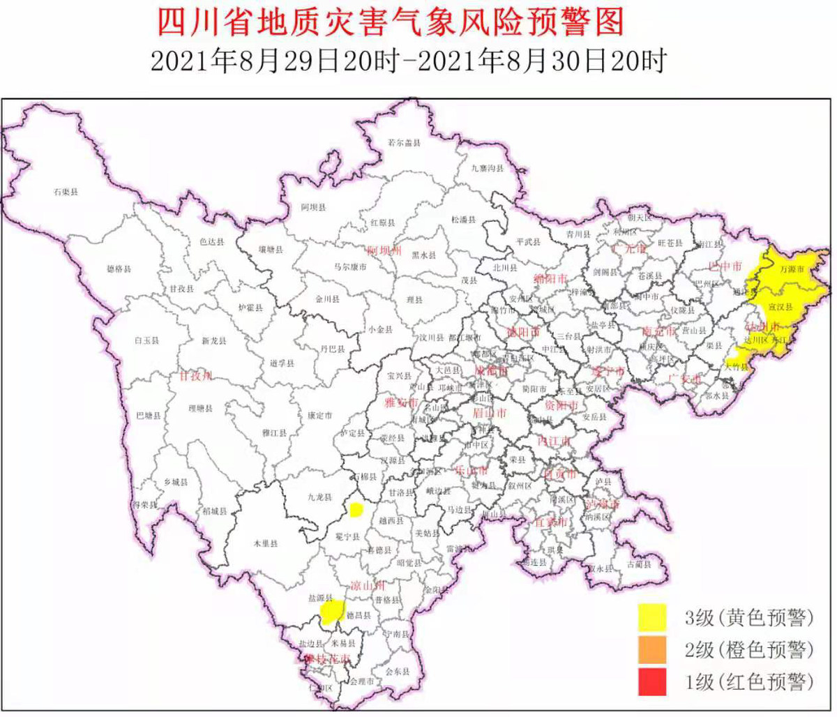 8月29日,四川省地质灾害指挥部办公室根据四川省地质环境条件,结合四川省气象台天气预报情况,发布地质灾害气象风险预警:8月29日20时至8月30日20时,3市(州)11个县(市、区)进入黄色预警范围。