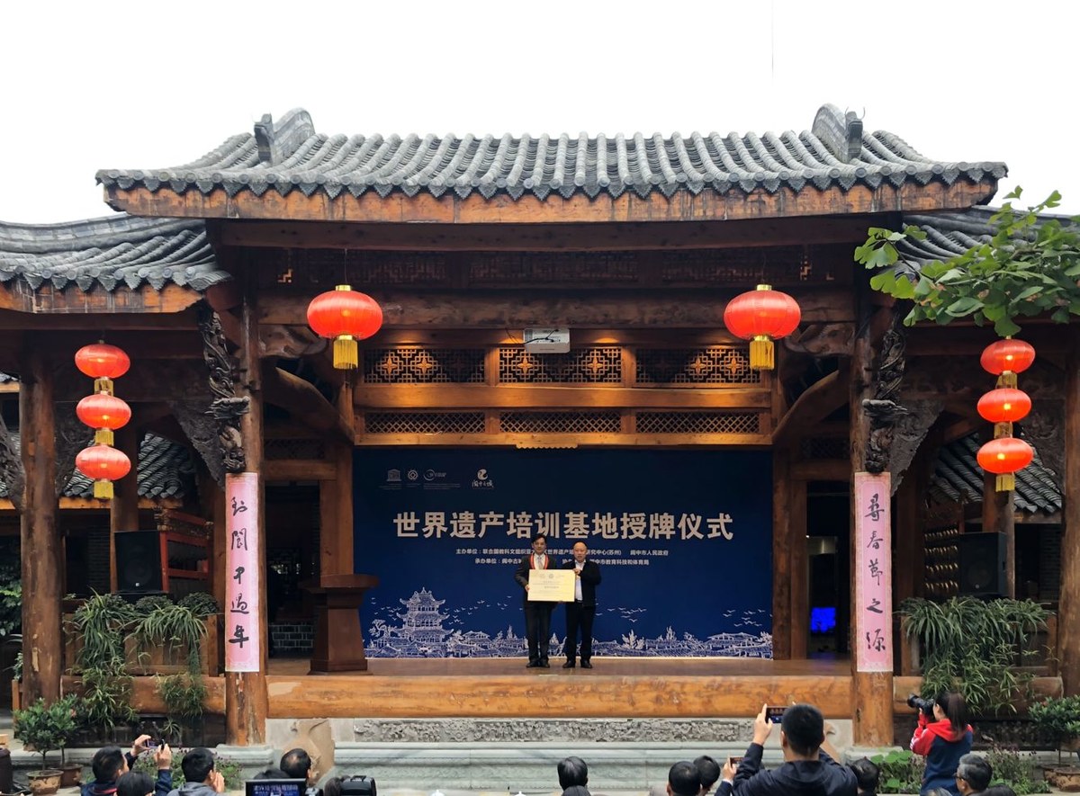 11月13日,“世界遗产青少年教育基地”与“世界遗产培训基地” 授牌仪式在阆中古城举行。联合国教科文组织亚太地区世界遗产培训与研究中心苏州分中心主任朱海俊向甘肃敦煌研究院授牌“世界遗产青少年教育基地”,苏州市园林和绿化管理局调研员周祺林向阆中古城景区管理局授牌“世界遗产培训基地”,也是亚太世遗苏州中心在国内首次授牌“世界遗产培训基地”。