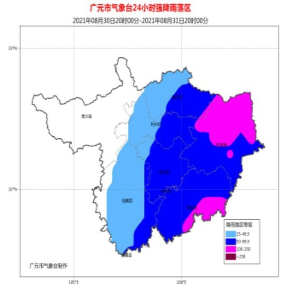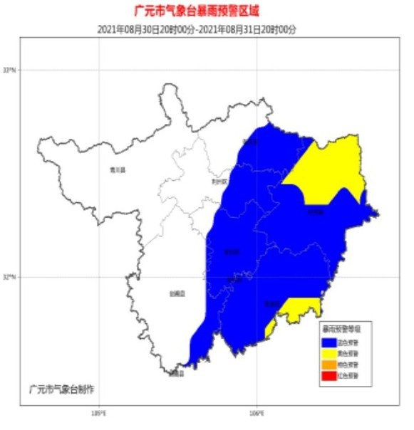 广元市气象台发布暴雨蓝色预警:受副高和底层西南暖湿气流共同影响,预计8月30日20时到31日20时,利州区东部、朝天区东部、昭化区、旺苍县、苍溪县和剑阁县东南部有暴雨(60-80毫米),局部大暴雨(100-150毫米),其余地方中到大雨。降雨时伴有短时强降水、雷电、阵性大风等强对流天气,请注意加强防范。