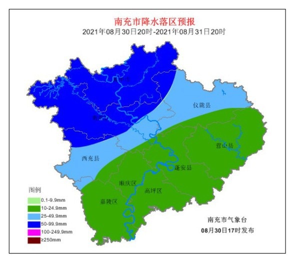 南充市气象台发布暴雨蓝色预警:预计8月30日20时到31日20时,阆中市、南部县有大雨到暴雨(40-80毫米),个别站点大暴雨(100-120毫米),最大小时雨强20-40毫米,其余地方中到大雨。