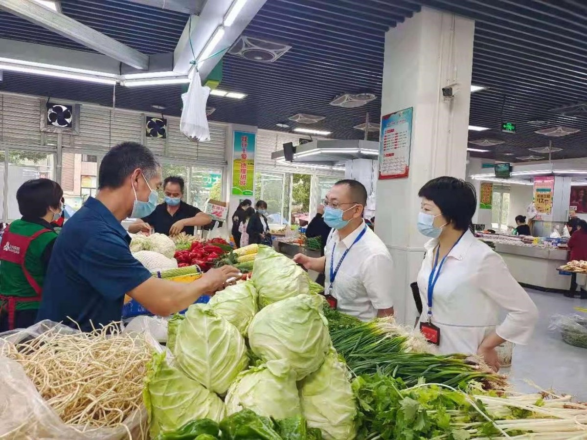 东兴区纪委监委派驻区市监局纪检监察组到农贸市场督查查码测温落实情况。