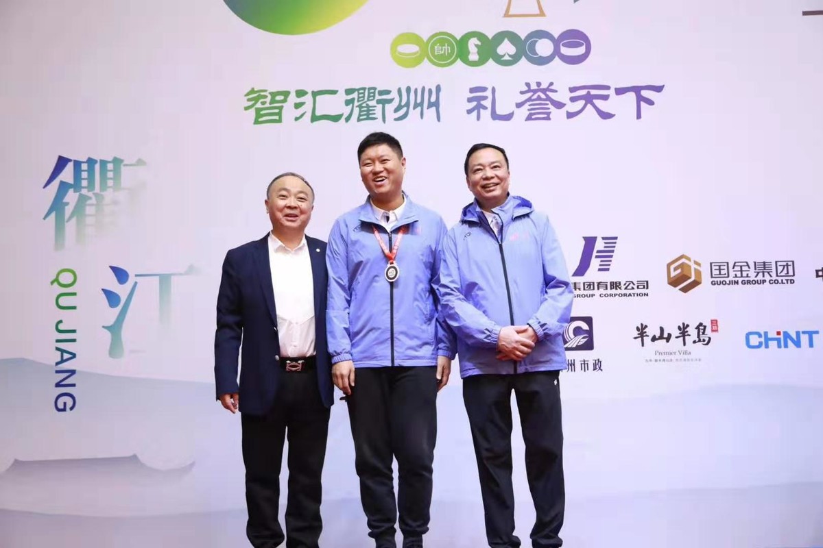 在争夺最激烈的象棋专业男子个人组,孟辰(中)获得亚军。左为成都棋院院长蒋全胜,右为四川象棋队主教练李艾东。