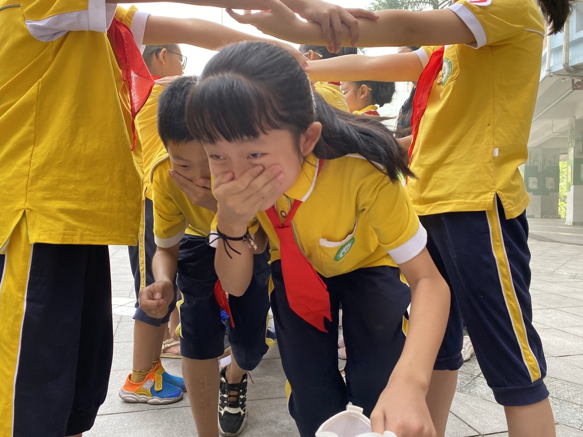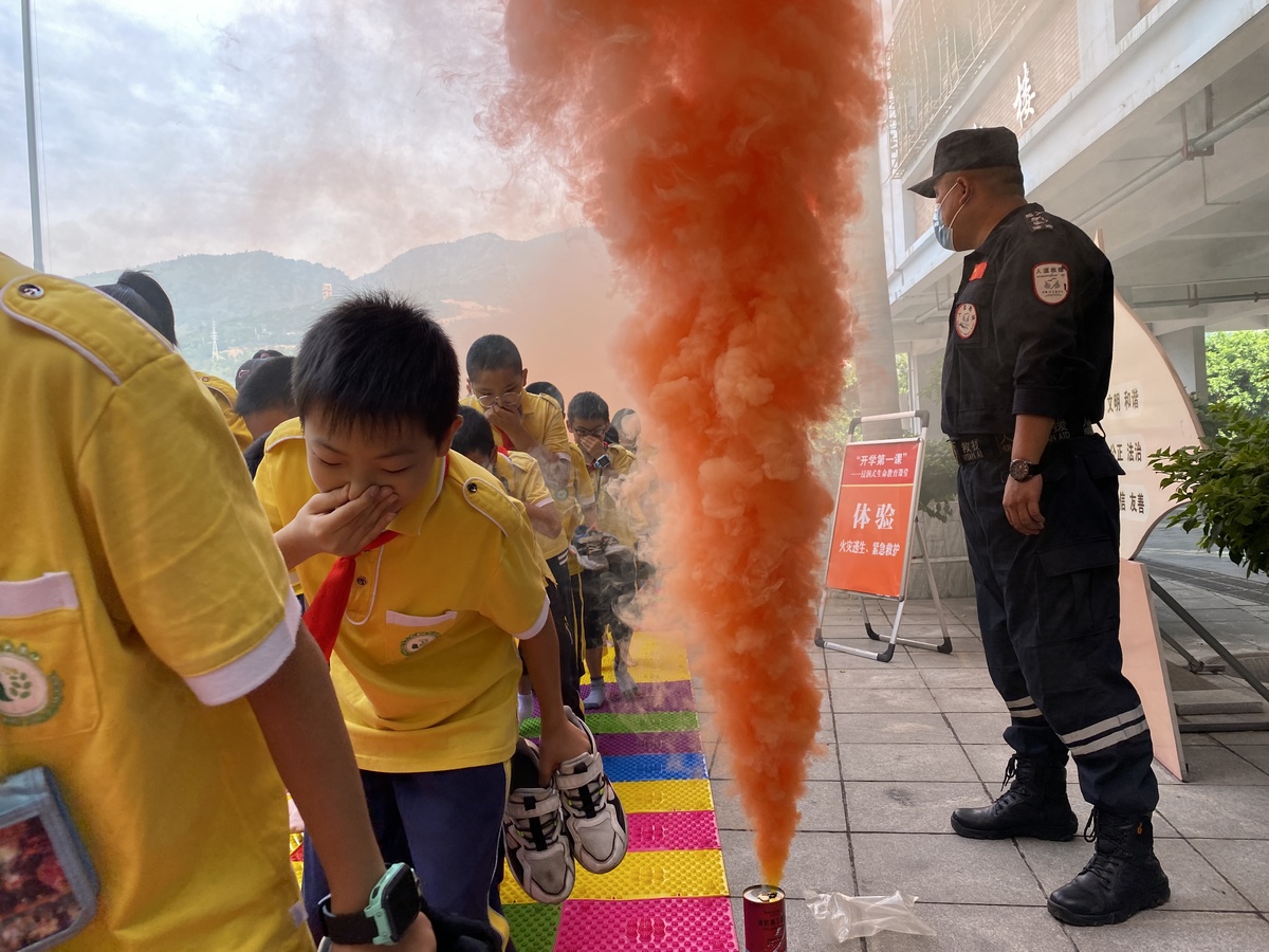 开学仪式后,凤凰小学校的大小操场成了临时户外课堂,1-6年级的学生被分成不同小组,学习卫生和防疫知识、防欺诈拐骗技巧、防范自然灾害和自救知识以及体验火灾逃生、紧急救护。